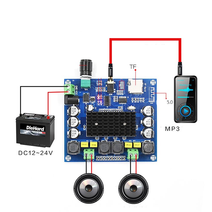 Kết nối đầu vào âm thanh với nguồn âm thanh, chẳng hạn như MP3, điện thoại di động, máy tính, thẻ nhớ SD, v.v. 3. Kết nối đầu ra âm thanh với loa, chú ý chiều âm và dương.