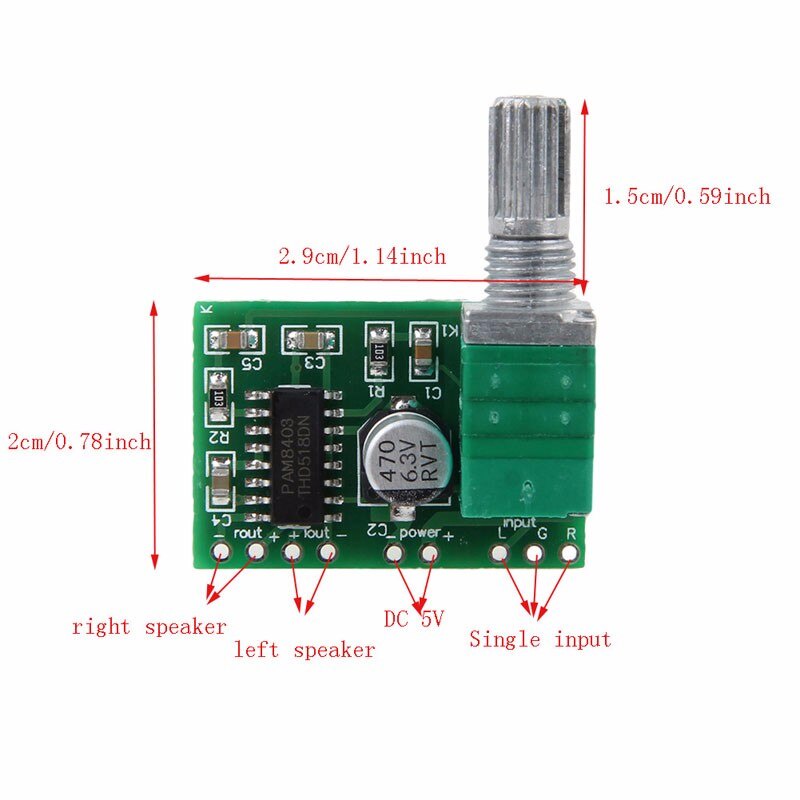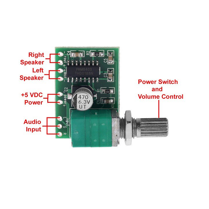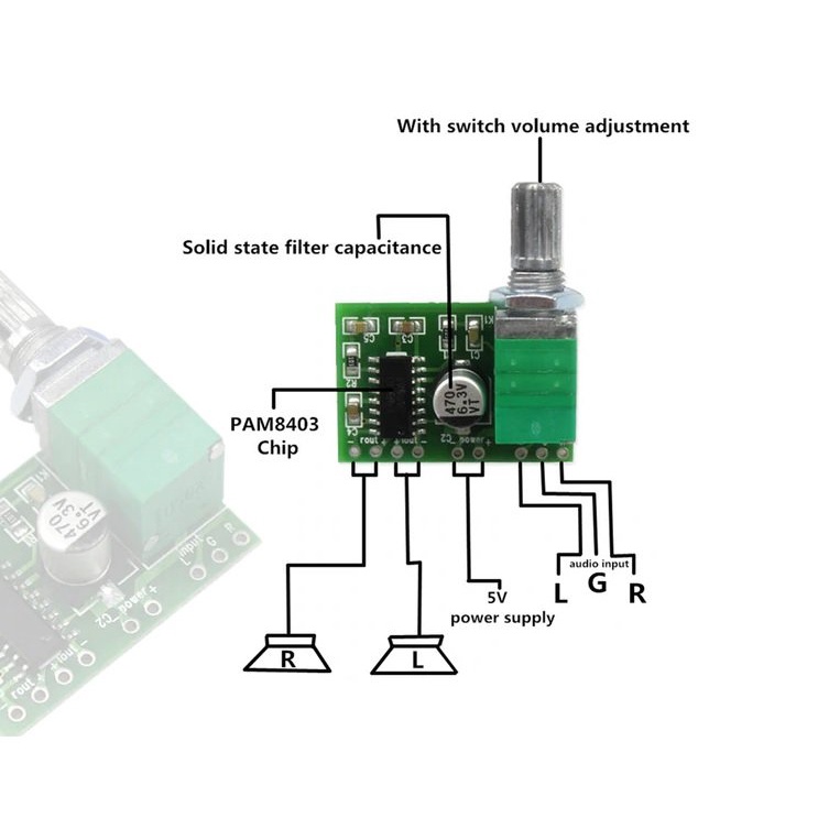 Mạch khuếch đại âm thanh PAM8403 6W Hifi 2.0 Class D (có chỉnh volume) với tổng công suất 6W cho 2 ngõ ra và có thể sử dụng với nguồn 5VDC thích hợp cho các ứng dụng khuếch đại âm thanh cần sự nhỏ gọn và sử dụng điện áp thấp (5V).Thông số kỹ thuật: