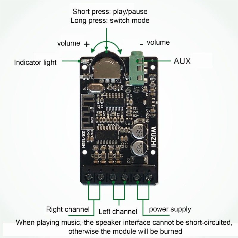 Mạch có bluetooth, cho công suất 15W x2 (2 kênh mỗi kênh 15W). Mạch chính hãng Wuzhi không có tiếng khởi động china. Nên dùng với nguồn 12V 3A trở lên để tối ưu công suất của mạch.Mạch được tặng bộ vỏ mica và tô vít.