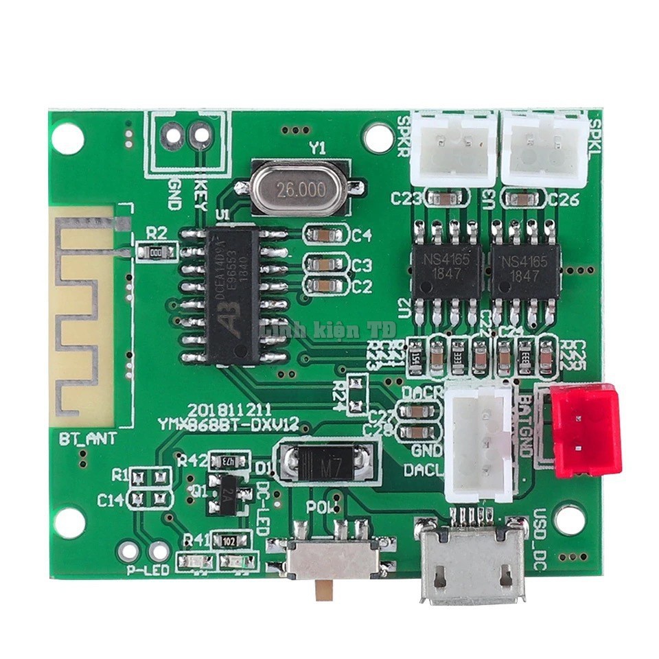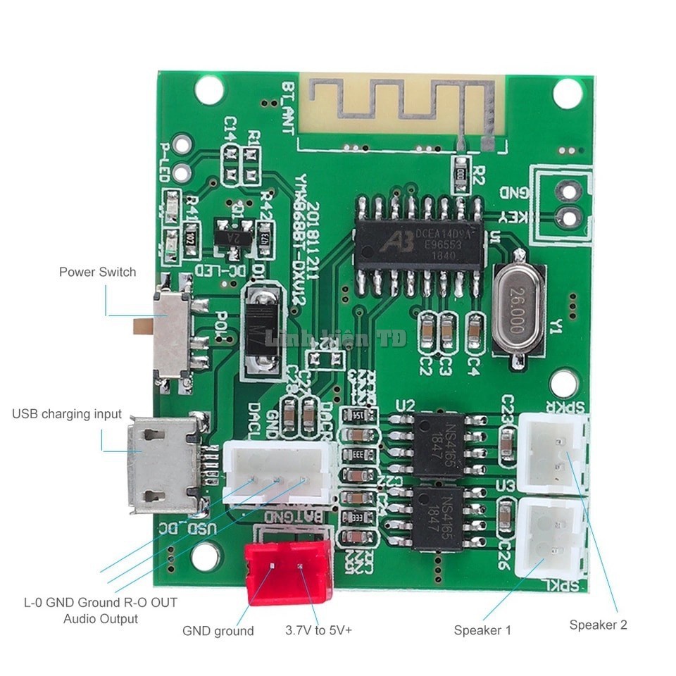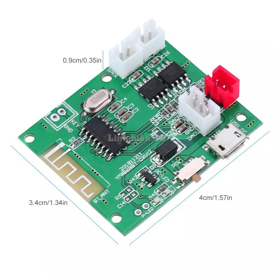 2) Làm việc điện áp pin lithium 3.7 V, hoặc quy định nguồn cung cấp DC DC 4.5-5 V, hiện tại (600-700MA khi kết nối với loa; 1.5-2A cho hai loa). Pin Lithium-trang bị loa với 4 ohms 3 W + 3 W, điện áp điều chỉnh Công Suất 5 V loa với 4 ohms 5 W + 5 W. Nếu hiện tại là không đủ, sẽ có một nhảy hoặc Bluetooth bất ổn, bo mạch chủ sẽ luôn khởi động lại hoặc chất lượng âm thanh không tốt/hỏng/biến dạng và các hiện tượng xấu (nếu bạn có vấn đề này, vui lòng kiểm tra điện); điện áp nên không được cao hơn 5 V