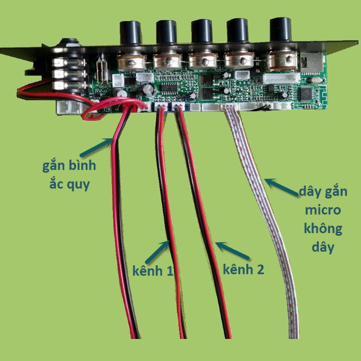 Phụ kiện kèm theo đủ: Remote, adapter 9V. dây pin và 2 dây loa đã lắp sẵn trên mạch và có ghi chú hướng dẫn cụ thể tránh sai sót gây hỏng mạch