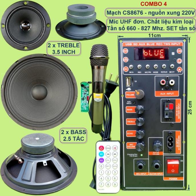 Mạch loa kéo 2.5 tấc đôi CS8676 60W – 120W có nguồn xung 220V kèm Micro đơn hoặc Micro đôi – Bluetooth Karaoke Guitar điệnCác combo chỉ khác nhau về bộ Micro. Các linh kiện khác của các combo là giống nhau bao gồm: 1 mạch loa kéo + phụ kiện (remote + dây nguồn 220V + dây bình ắc qui + dây loa) + 2 Bass 2.5 tấc + 2 Treble 3.5 inch từ kép