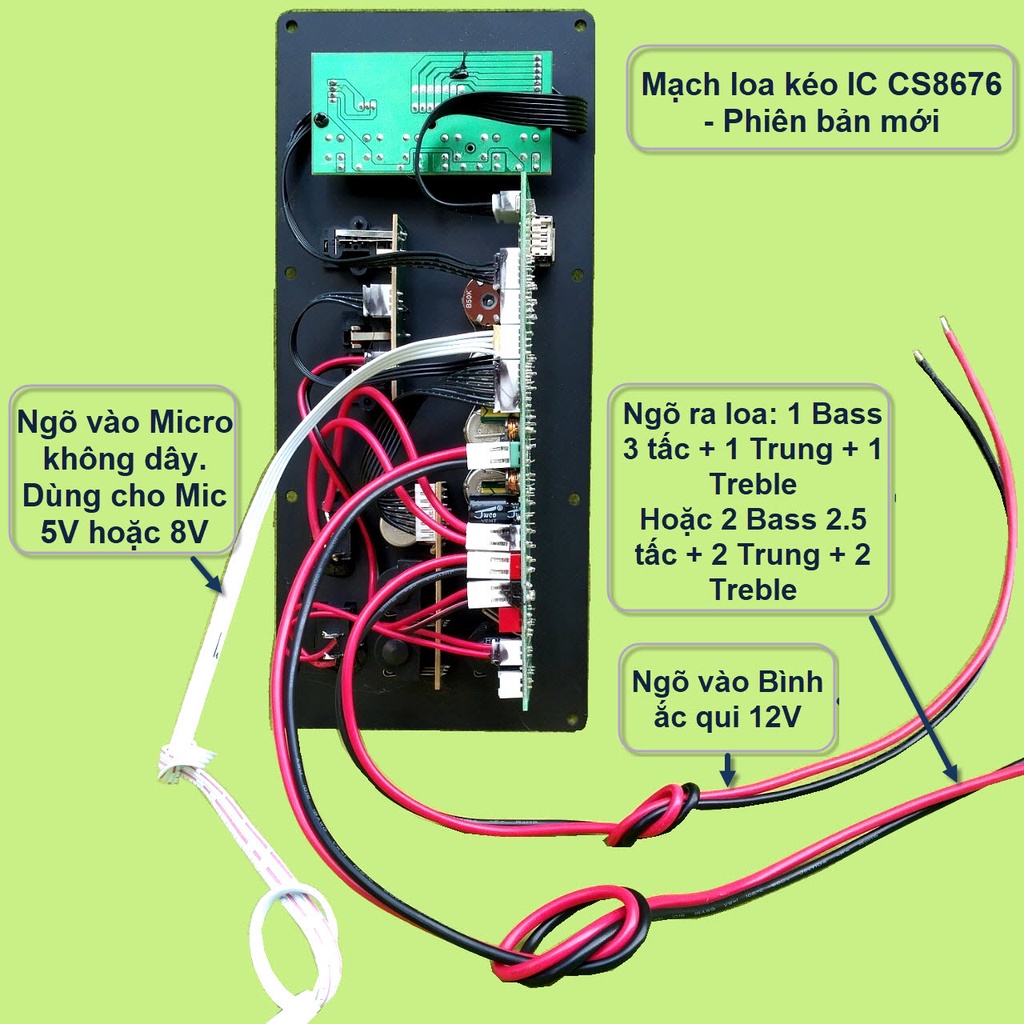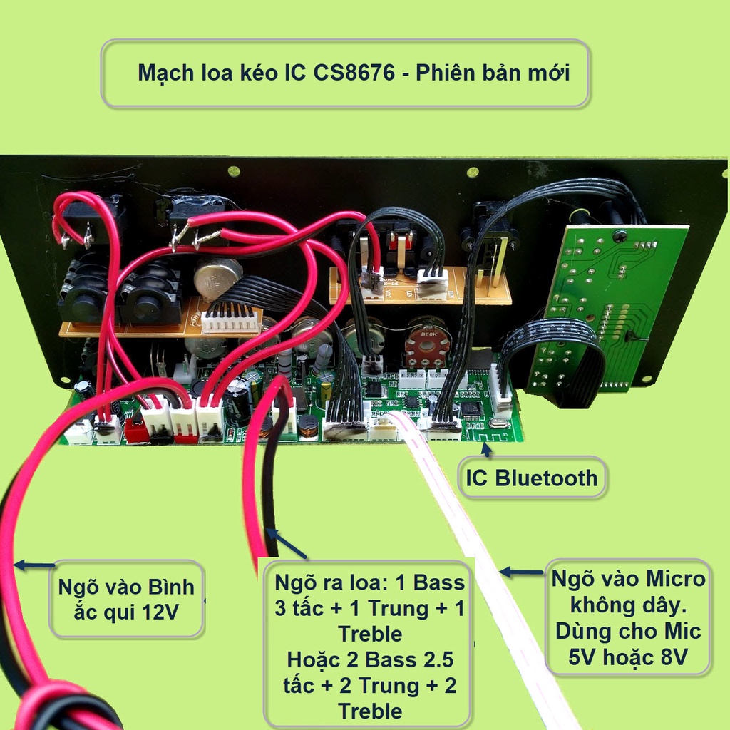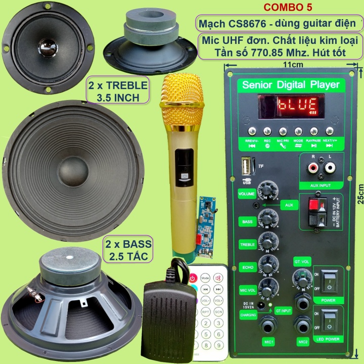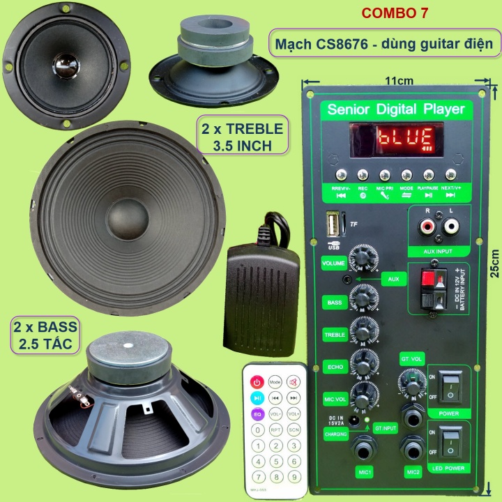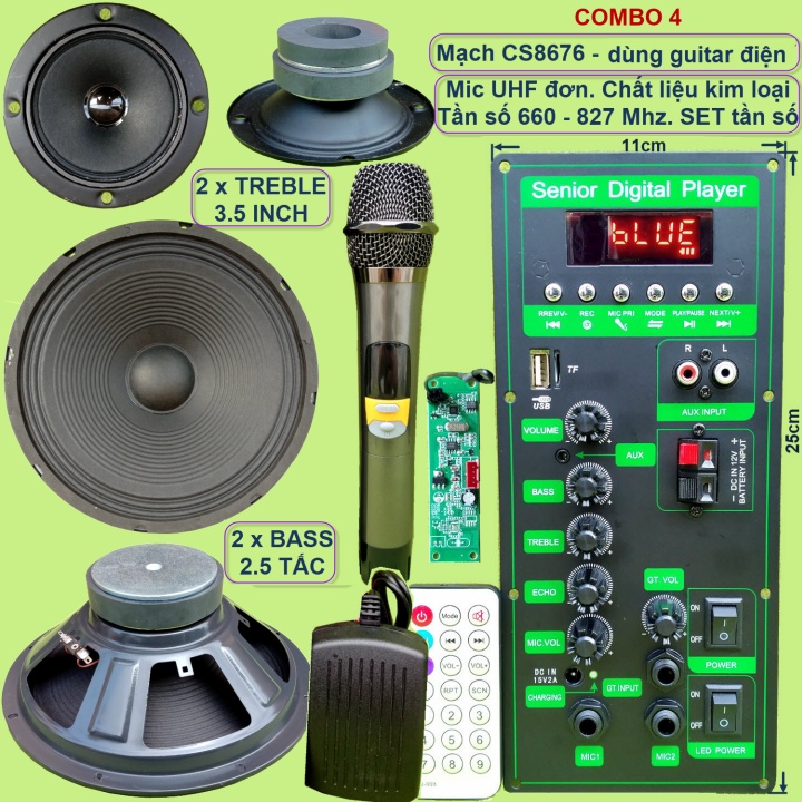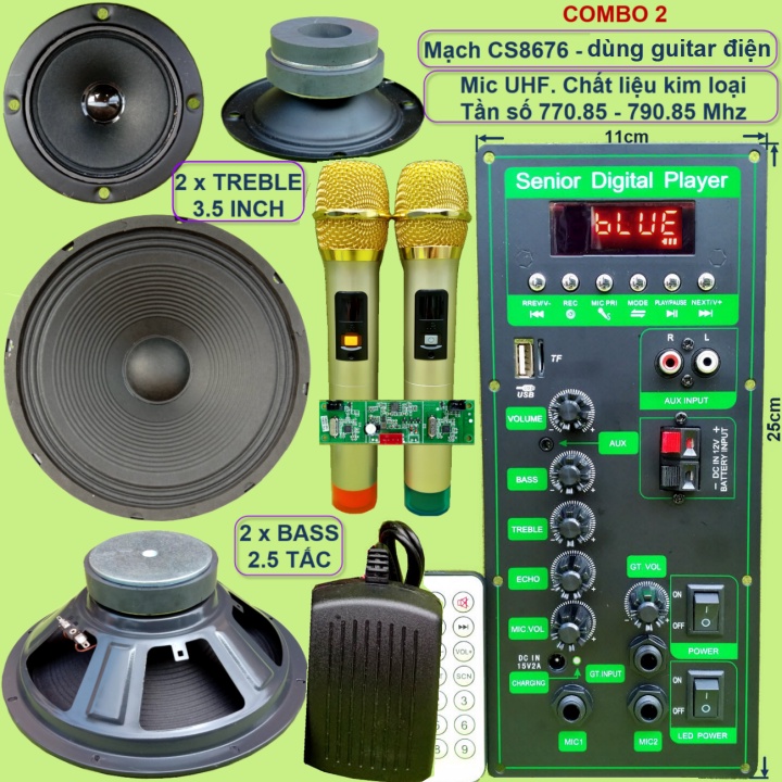 Mạch loa kéo 2.5 tấc đôi CS8676 60W – 120W kèm Micro đơn hoặc Micro đôi – Bluetooth Karaoke Guitar điệnCác combo chỉ khác nhau về bộ Micro. Các linh kiện khác của các combo là giống nhau bao gồm: 1 mạch loa kéo + phụ kiện (remote + adapter sạc 15V + dây bình ắc qui + dây loa+dây micro) + 2 Bass 2.5 tấc + 2 Treble 3.5 inch từ kép