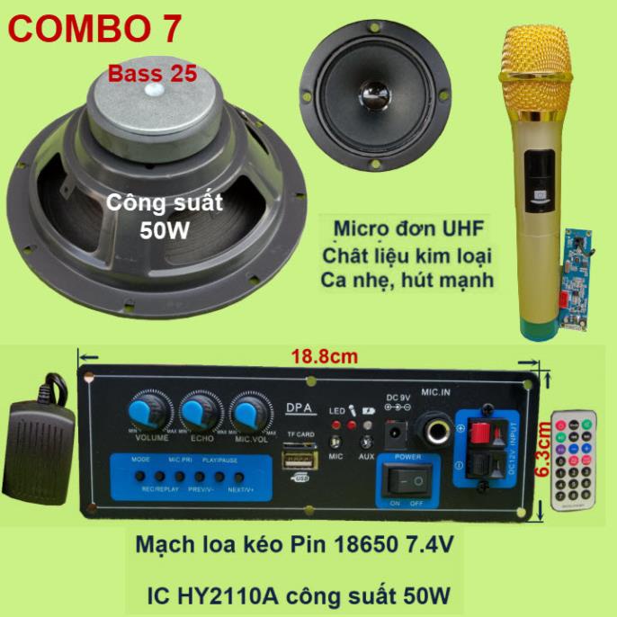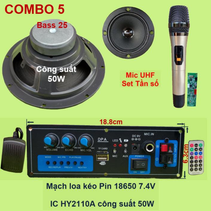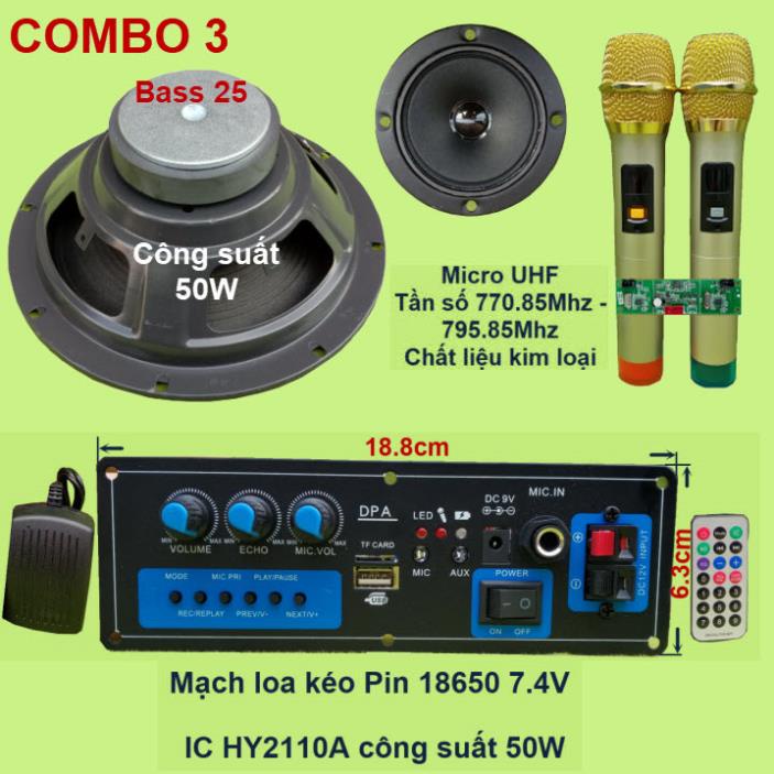 Mạch loa kéo 2.5 tấc dùng pin 18650 7.4V công suất 50W IC HY2110ACombo gồm: 1 Mạch loa kéo (kèm phụ kiện), 1 Loa Bass 20, 1 loa Treble 3inch, 1 bộ Micro không dây như hình.