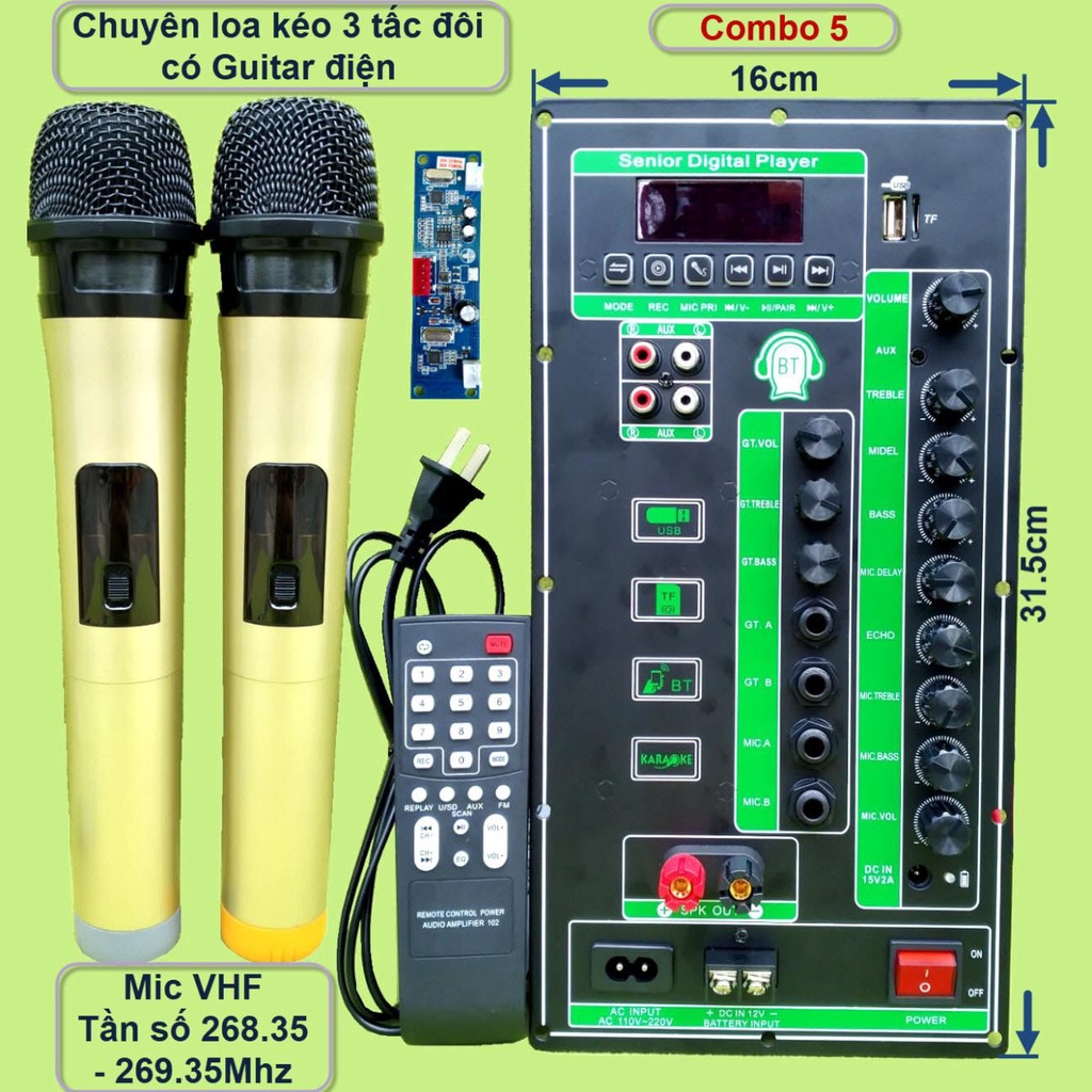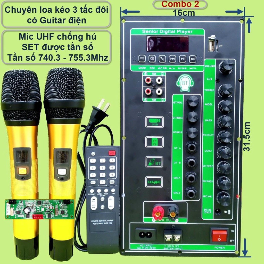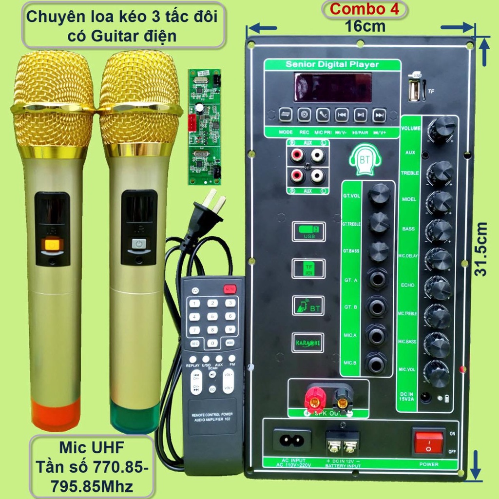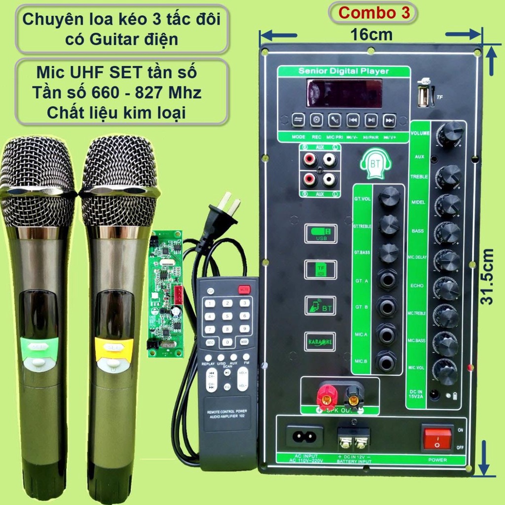 Mạch loa kéo 2 kênh 3 tấc đôi có Guitar điện 2 IC CS8676 120W + 120W có nguồn xung 220V kèm Micro UHF đôiCác combo chỉ khác nhau về bộ Micro