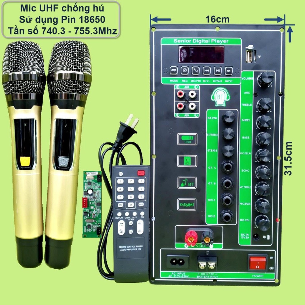 Combo 2: 1 cặp Mic UHF chống hú vàng + 1 mạch loa kéo + phụ kiện (remote + dây nguồn 220V + dây bình ắc qui + dây loa)
