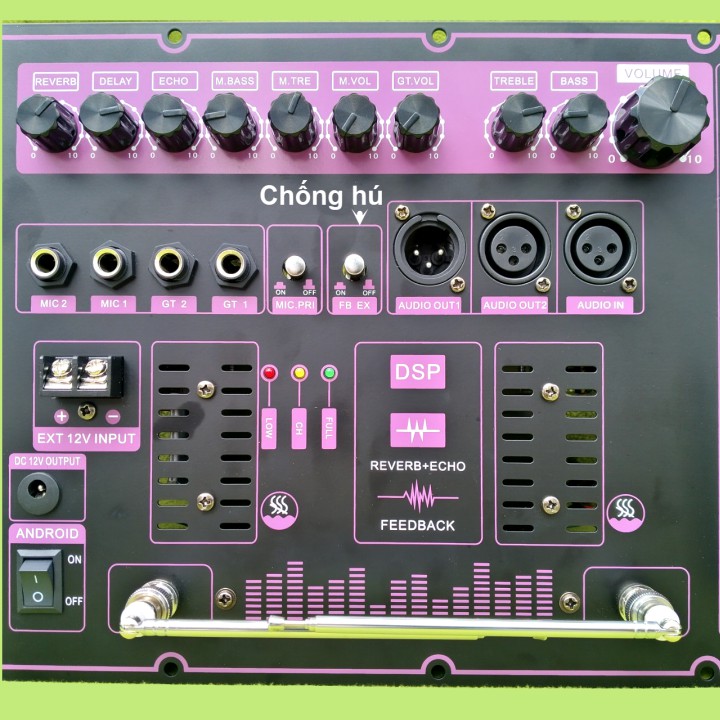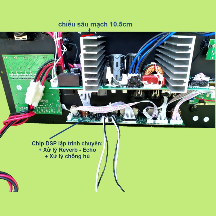 - Sử dụng chip DSP lập trình cho âm thanh Reverb – Echo chuyên nghiệp và kết hợp lập trình chống hú (nút FB EX trên bo mạch).