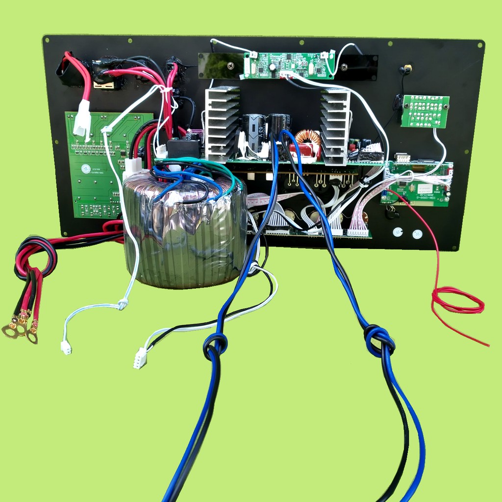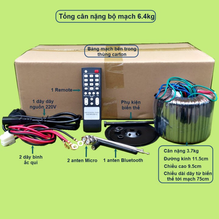 - Bộ mạch bao gồm: 1 bảng mạch (có thùng carton) + 1 biến thế xuyến kèm phụ kiện + 2 dây bình ắc qui + 1 remote điều khiển + 2 anten Micro + 1 Anten Bluetooth