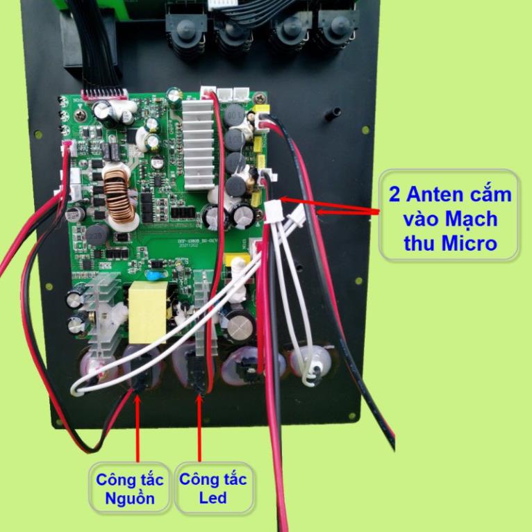 - Có ngõ 2 ngõ vào Micro không dây – dùng 2 bo mạch thu – 4 tay micro (OUT KC +8V GND)