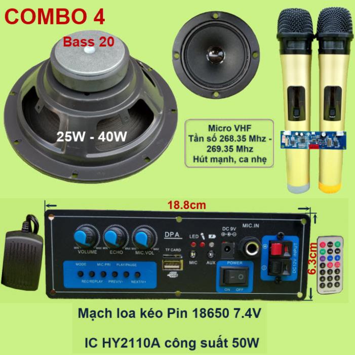 Mạch loa kéo 2 tấc dùng pin 18650 7.4V công suất 50W IC HY2110ACombo gồm: 1 Mạch loa kéo (kèm phụ kiện), 1 Loa Bass 20, 1 loa Treble 3inch, 1 bộ Micro không dây như hình.