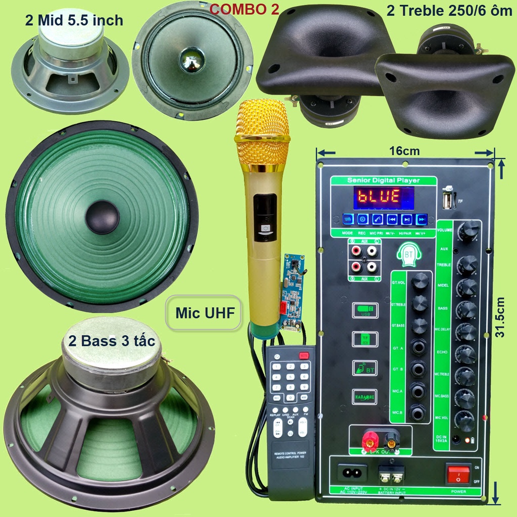 1 bộ Mic đơn UHF xám đen + 1 mạch loa kéo 2 kênh + phụ kiện (remote + dây nguồn 220V + dây bình ắc qui + dây loa) + 2 loa Bass 3 tấc + 2 loa Mid 5.5 inch + 2 Treble 250 6 ôm