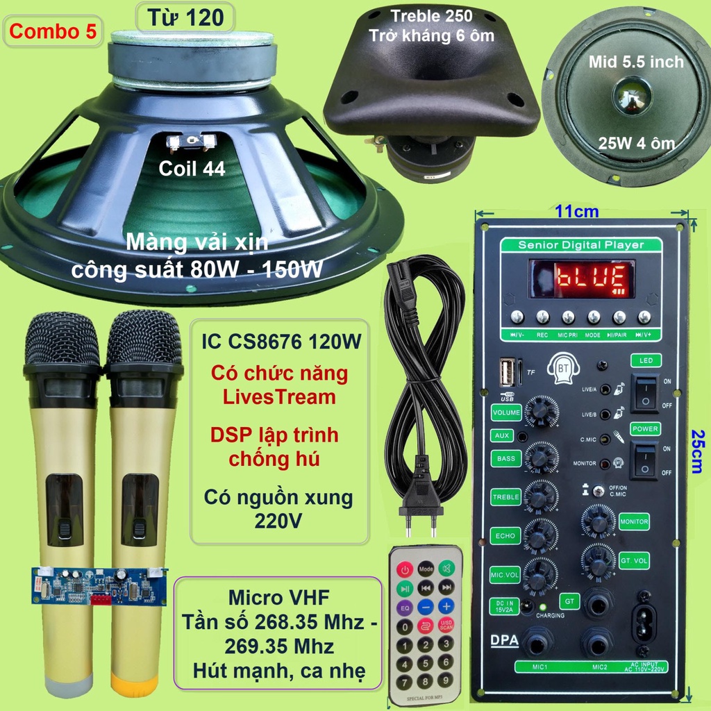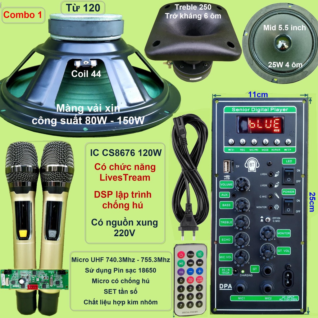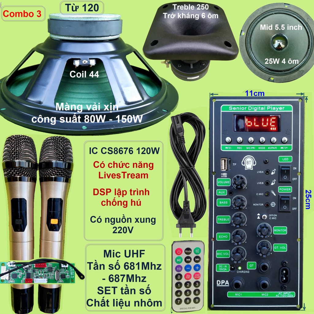 Mạch loa kéo 3 tấc đơn 3 đường tiếng LIVESTREAM DSP chống hú IC CS8676 120W nguồn xung 220V - kèm loa và microCác combo chỉ khác nhau về bộ Micro:Mic UHF/VHF + 1 mạch loa kéo CS8676 LIVESTREAM + phụ kiện + 1 loa Bass 3 tấc + 1 loa Mid 5.5 inch + 1 Treble 250. Combo 6 không micro