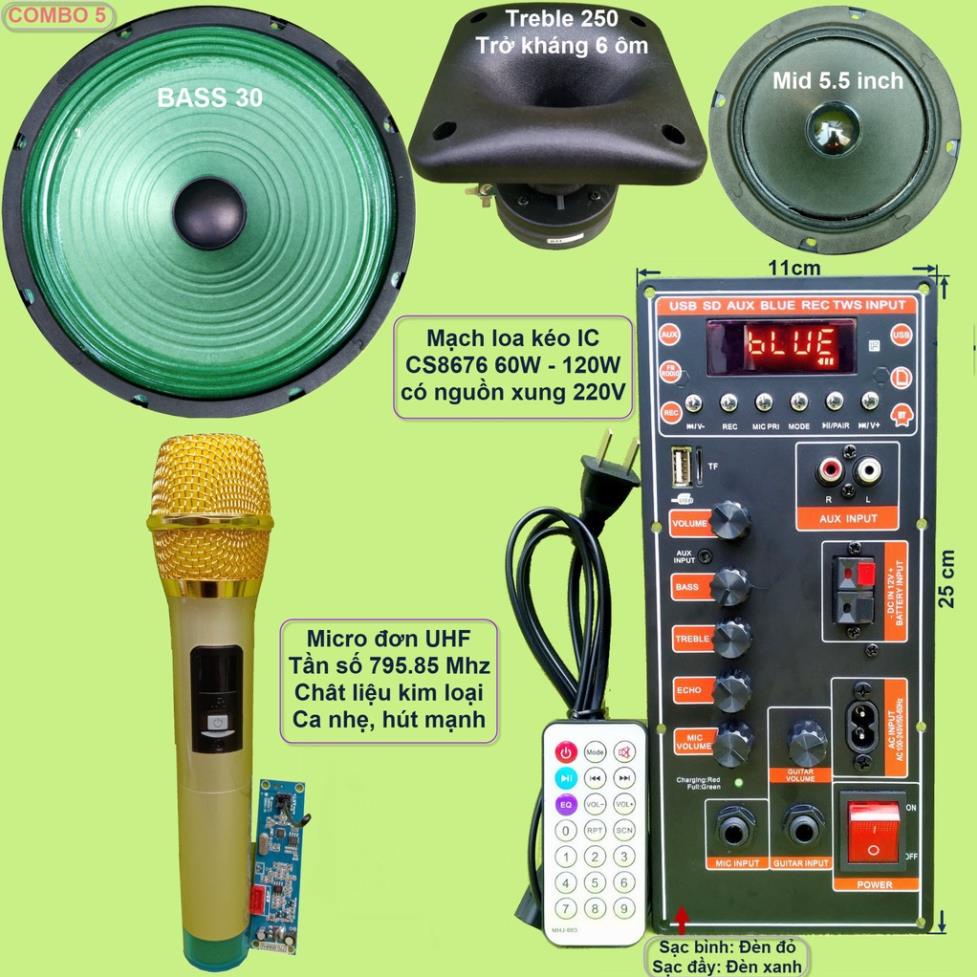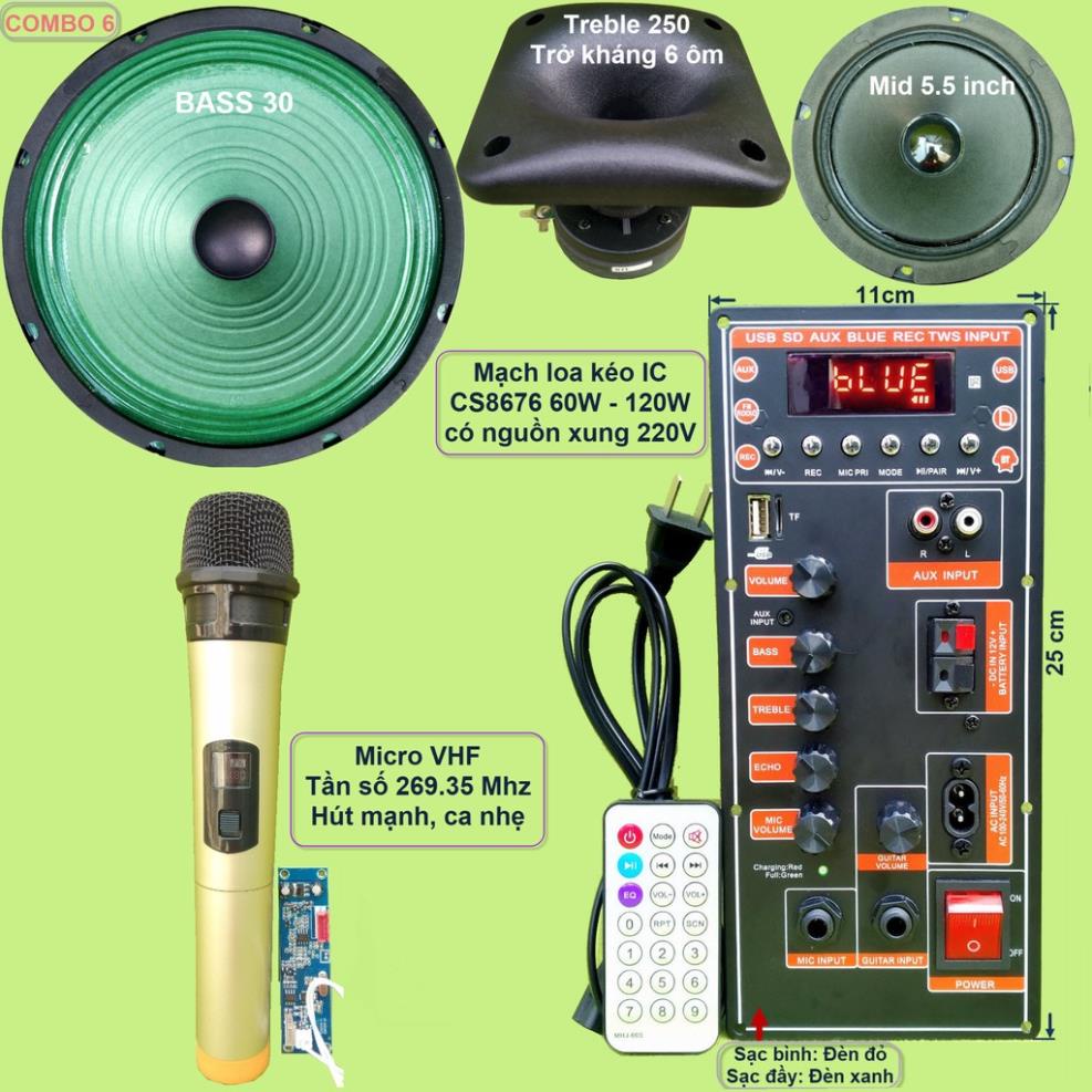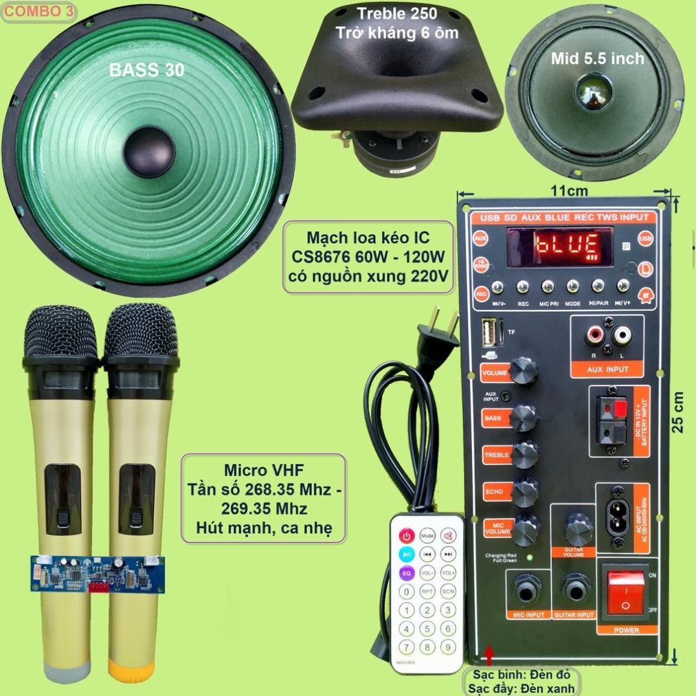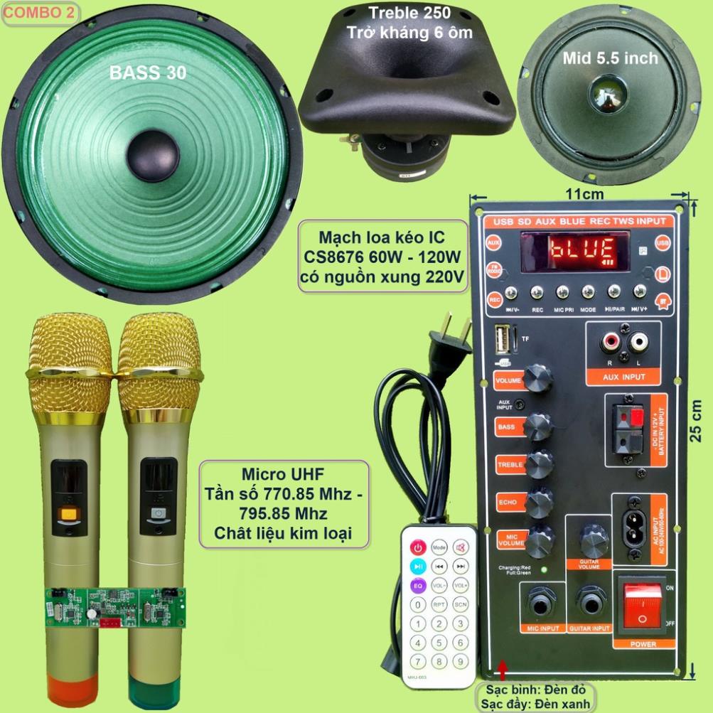 Các combo chỉ khác nhau về bộ MicroCombo 1-3: 1 cặp Mic UHF /VHF + 1 mạch loa kéo CS8676 có nguồn xung + 1 loa Bass 3 tấc + 1 loa Mid 5.5 inch + 1 Treble 250 6 ôm