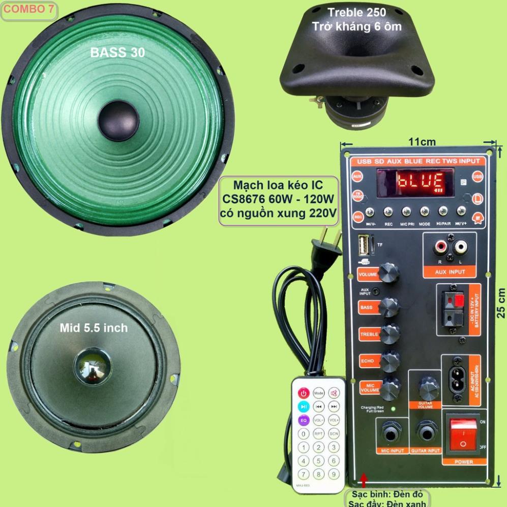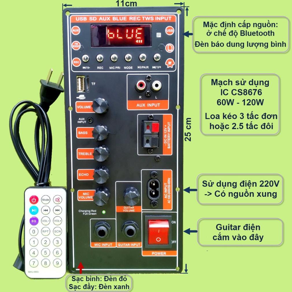 Mạch loa kéo 3 tấc đơn 3 đường tiếng CS8676 công suất 120W có nguồn xung 220V kèm Bass 3 tấc màng xanh Treble 250 Micro