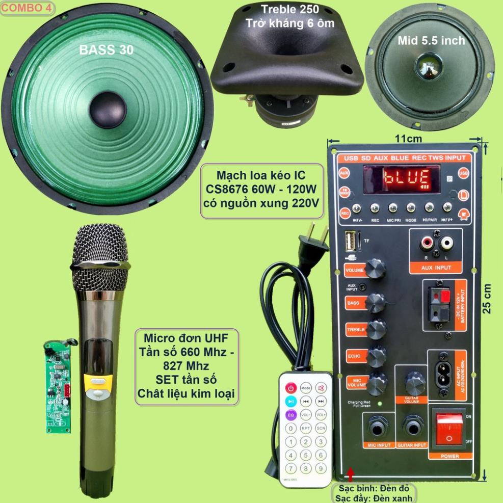Combo 3-6: 1 Mic đơn UHF/VHF + 1 mạch loa kéo CS8676 có nguồn xung + 1 loa Bass 3 tấc + 1 loa Mid