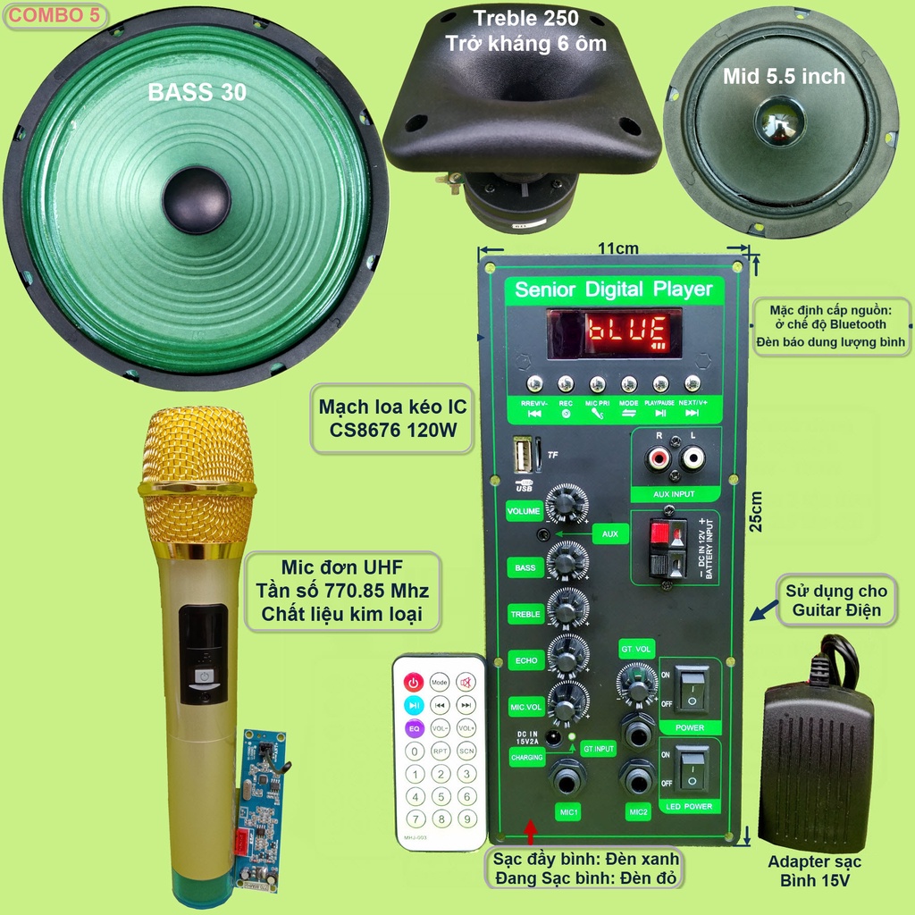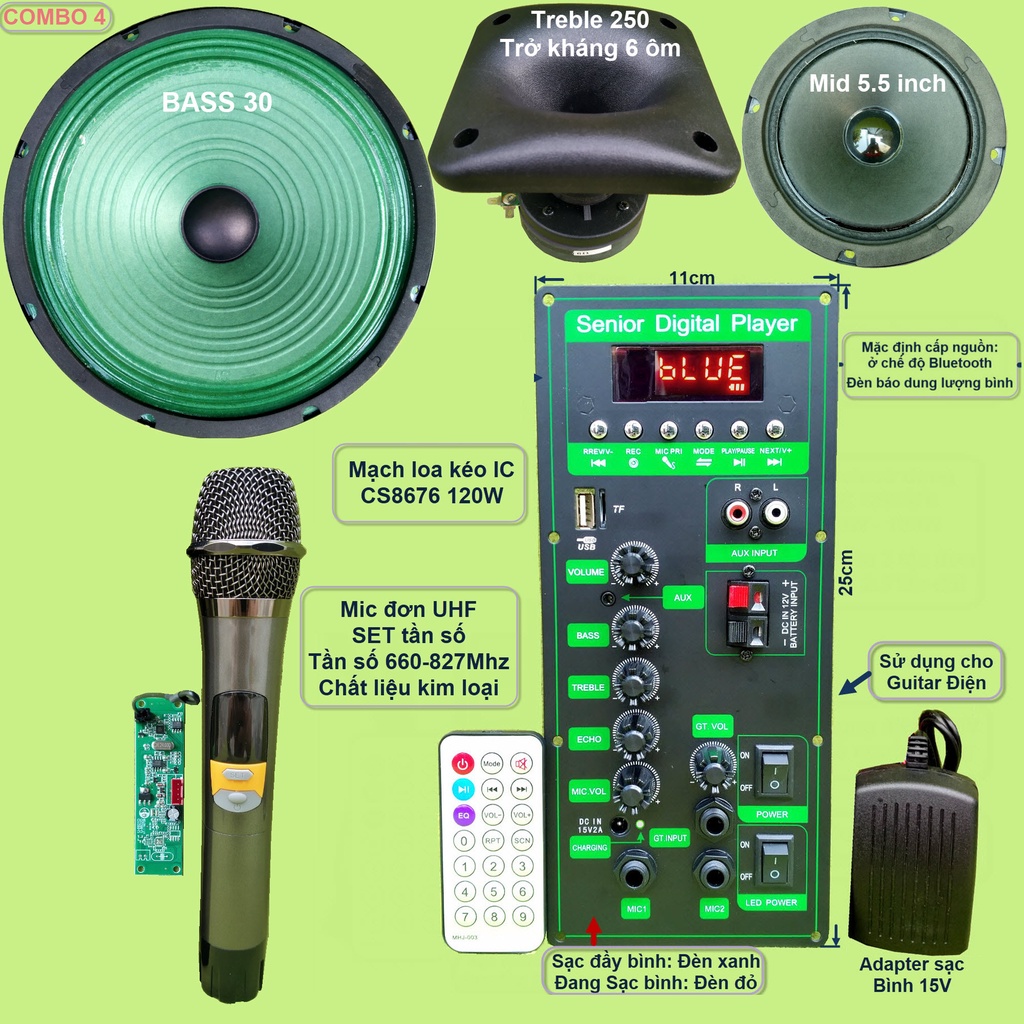 Các combo chỉ khác nhau về bộ MicroCombo 1-3: 1 cặp Mic UHF /VHF + 1 mạch loa kéo CS8676 + 1 loa Bass 3 tấc + 1 loa Mid 5.5 inch + 1 Treble 250 6 ôm