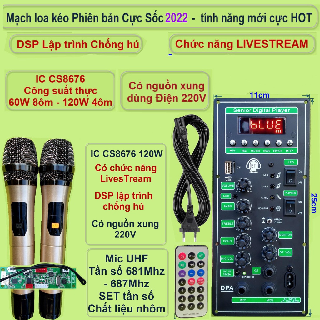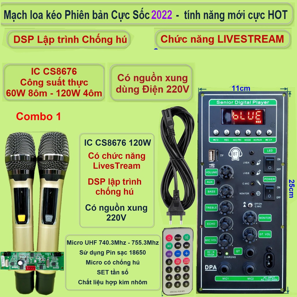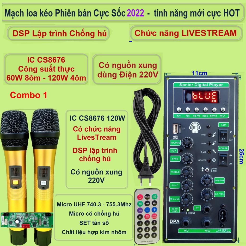 Mạch loa kéo 3 tấc đơn 3 đường tiếng LIVESTREAM DSP chống hú IC CS8676 120W nguồn xung 220V micro đôiCác combo chỉ khác nhau về bộ Micro:Mic UHF/VHF + 1 mạch loa kéo CS8676 LIVESTREAM + phụ kiện