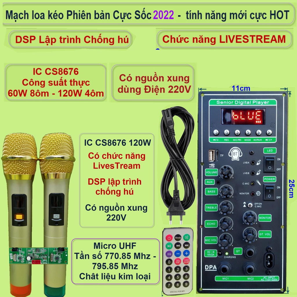 Mạch loa kéo 3 tấc đơn 3 đường tiếng LIVESTREAM DSP chống hú IC CS8676 120W nguồn xung 220V và micro đôi