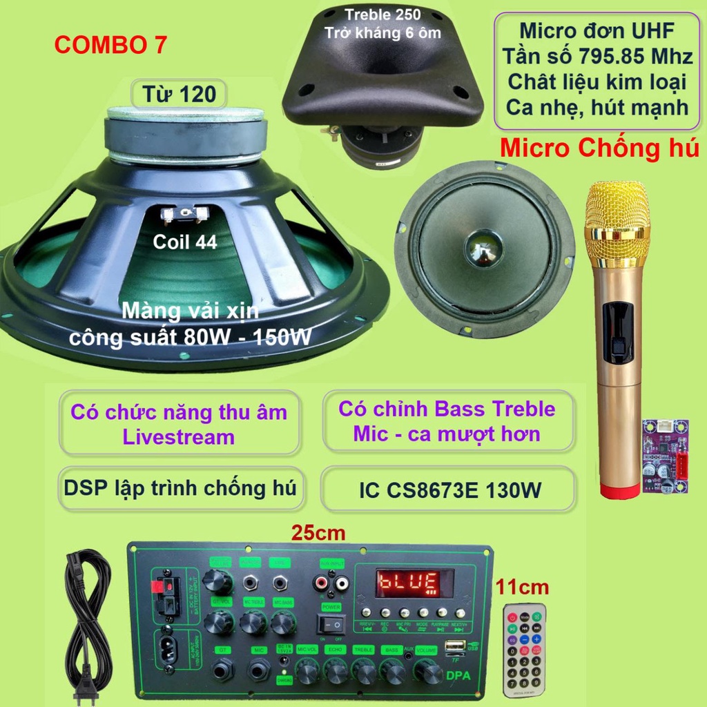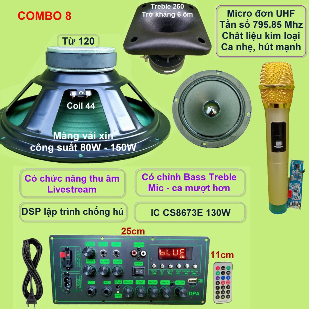 Mạch loa kéo 3 tấc đơn CS8673E 130W, thu âm LIVESTREAM, DSP lập trình chống hú có chỉnh Bass Treble Micro, nguồn xung 220VCombo gồm: 1 Mạch loa kéo (kèm phụ kiện), 1 Loa Bass 30, 1 loa Treble 250 kèm phễu, 1 loa trung 14, 1 bộ Micro không dây như hình.