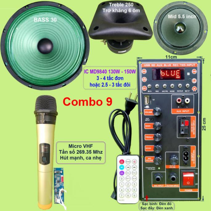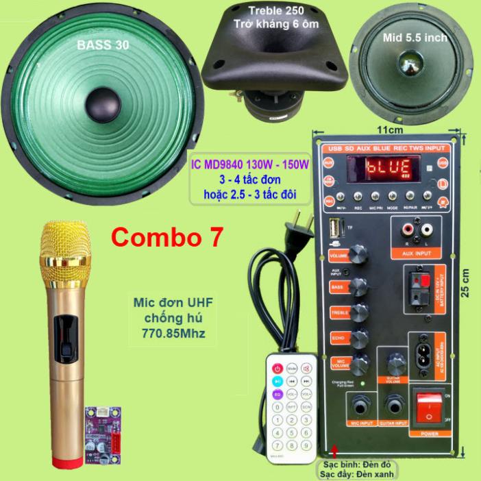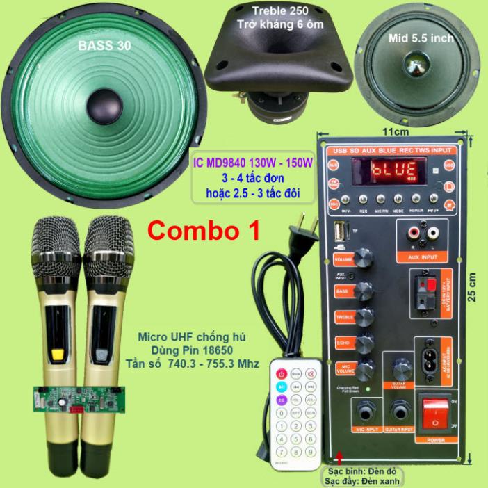 Mạch loa kéo 3 tấc đơn IC MD9840 130W - 150W DSP lập trình chống hú, nguồn xungCombo gồm: 1 Mạch loa kéo (kèm phụ kiện), 1 bộ Micro không dây như hình, 1 Bass 30, 1 loa trung 14, 1 loa treble 250 kèm phễu