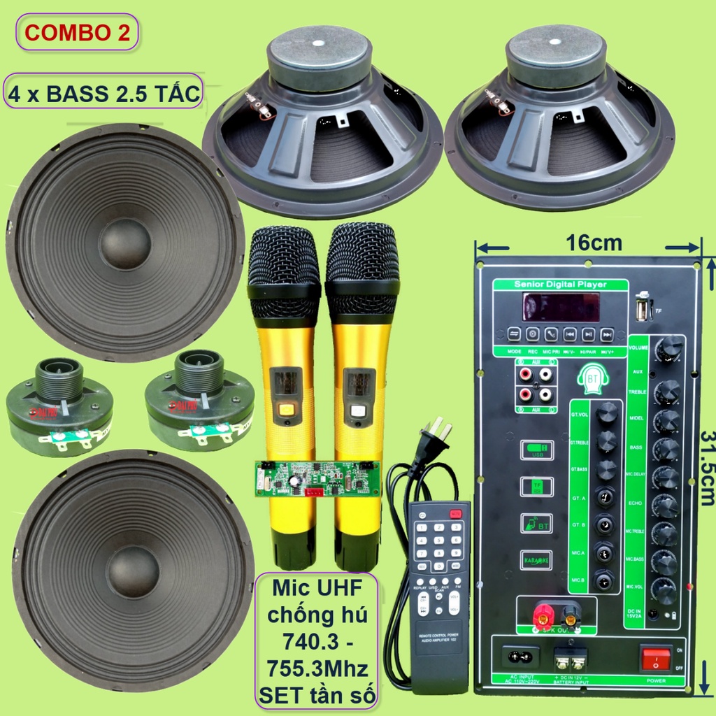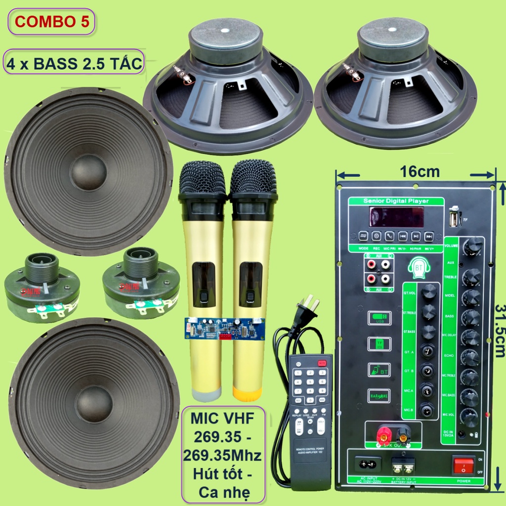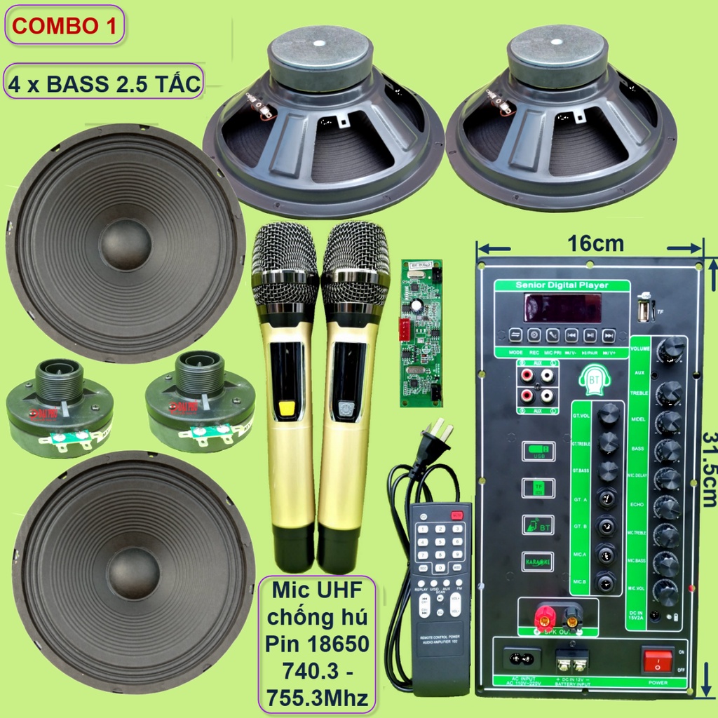 Nguyên bộ gồm: 1 Bộ Micro + 1 mạch loa kéo + phụ kiện (remote + dây nguồn 220V + dây bình ắc qui + dây loa) + 4 Bass 2.5 tấc + 2 Treble 250