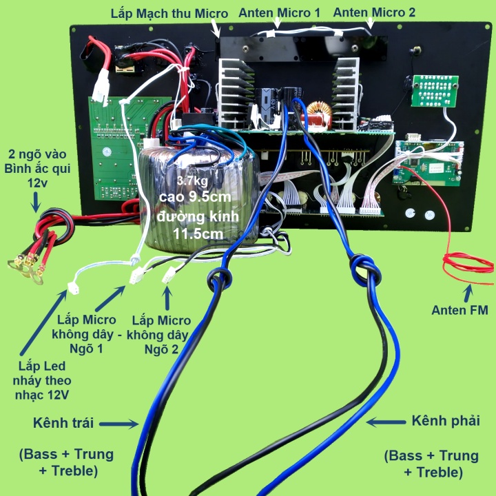 - Bo mạch có 2 kênh: Kênh phải lắp 1 Bass + 1 Trung + 1 Treble. Kênh trái tương tự