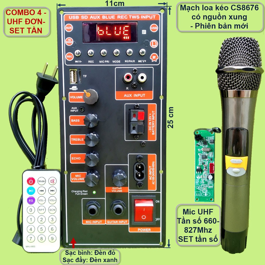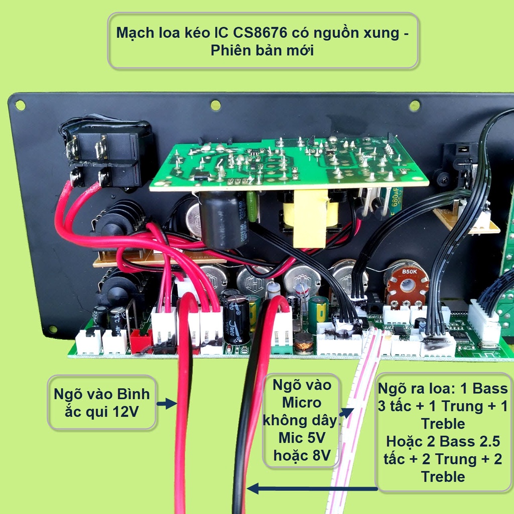 - Mạch loa kéo CS8676 có nguồn xung – phiên bản mới nhất có nhiều đặc điểm mới và ấn tượng:Bluetooth thế hệ mới đáp ứng âm thanh ngõ ra tốt. Có đèn báo dung lượng Bình để giám sát trạng thái Bình ắc qui