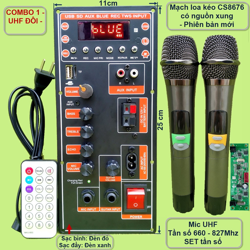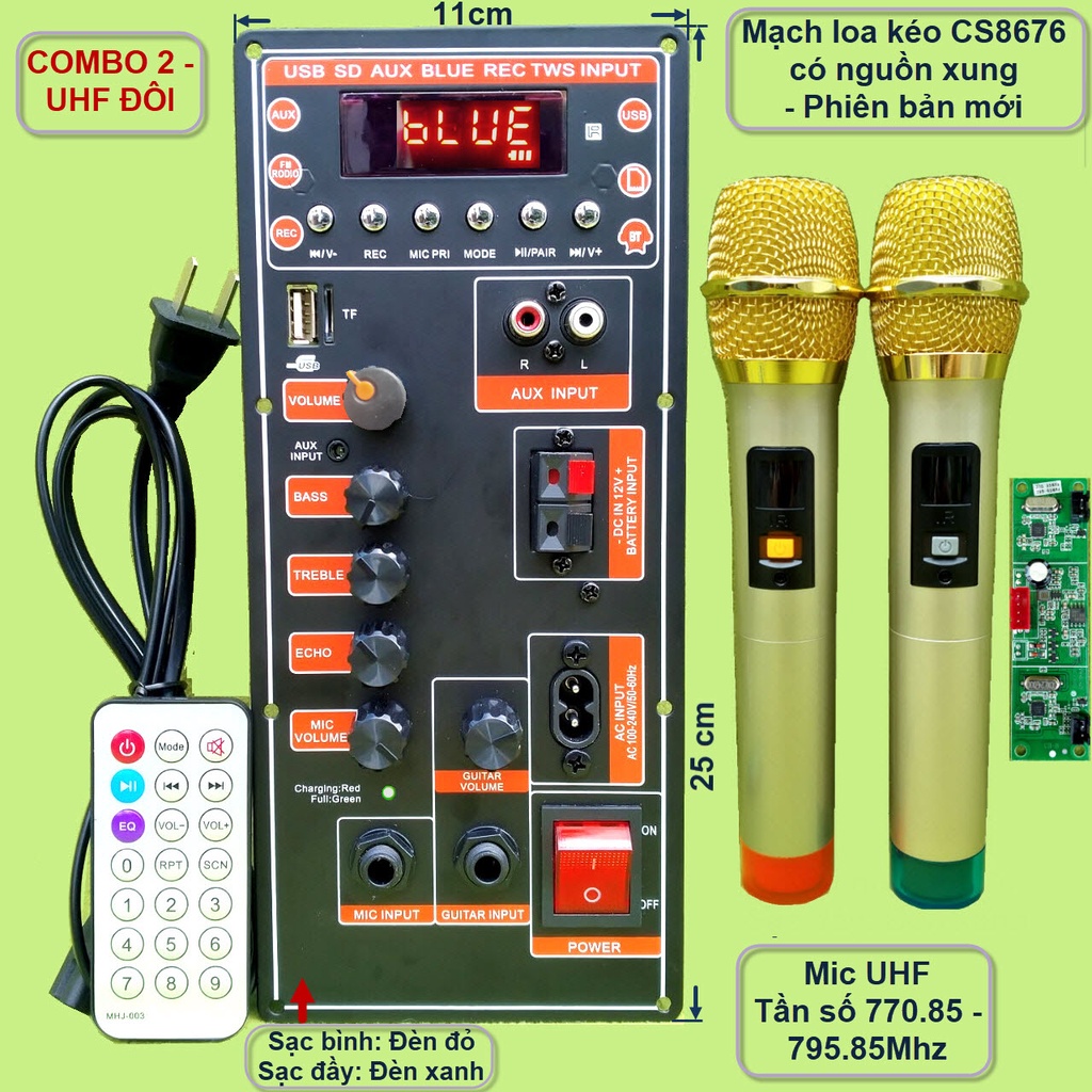 Mạch loa kéo CS8676 có nguồn xung kèm Micro đơn hoặc Micro đôi – Bluetooth Karaoke Guitar điện – cho loa kéo 3 tấc đơn