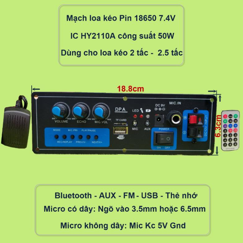 Mạch loa kéo pin 18650 7.4V công suất 50W IC HY2110A loa kéo 2 tấc – 2.5 tấc – Karaoke BluetoothĐặc điểm nổi bật: