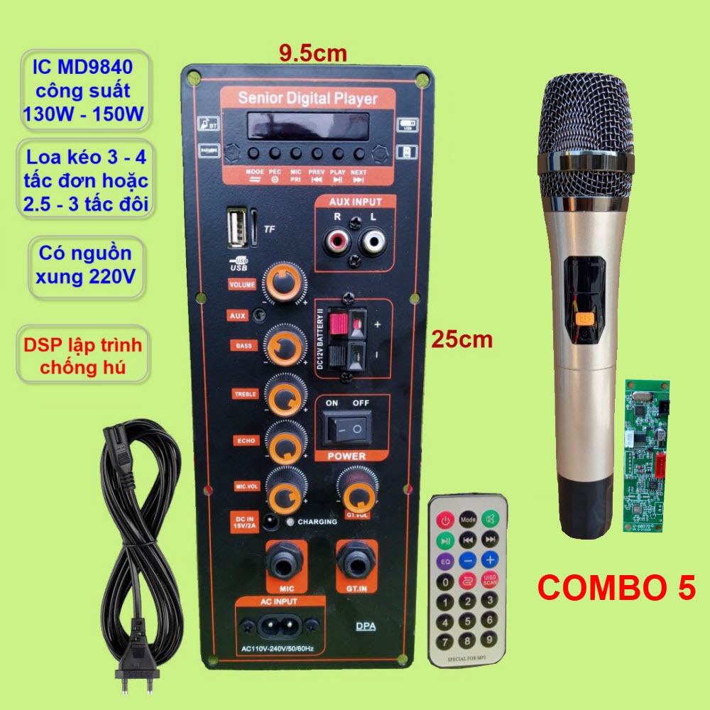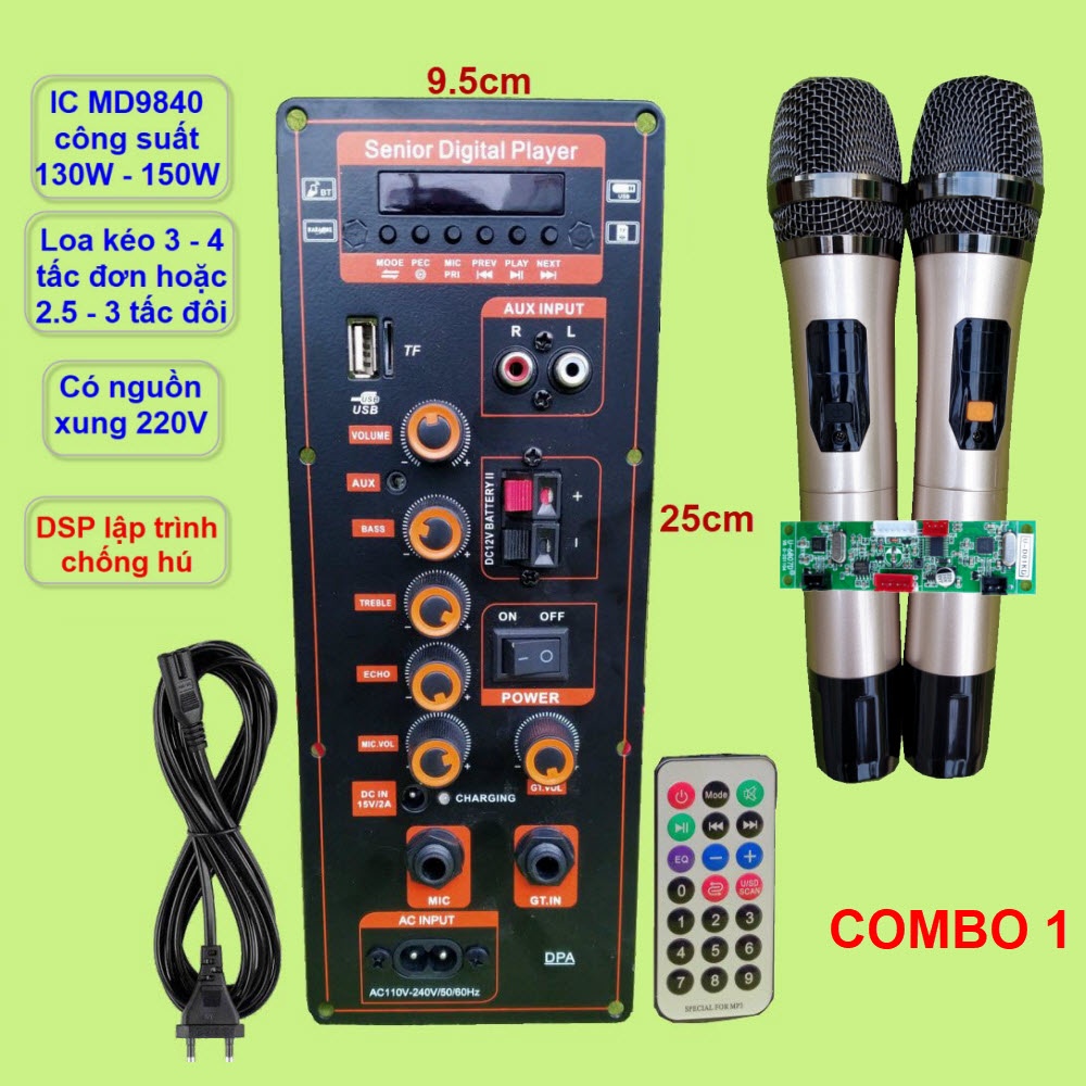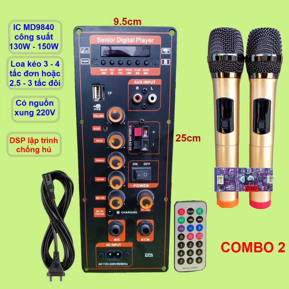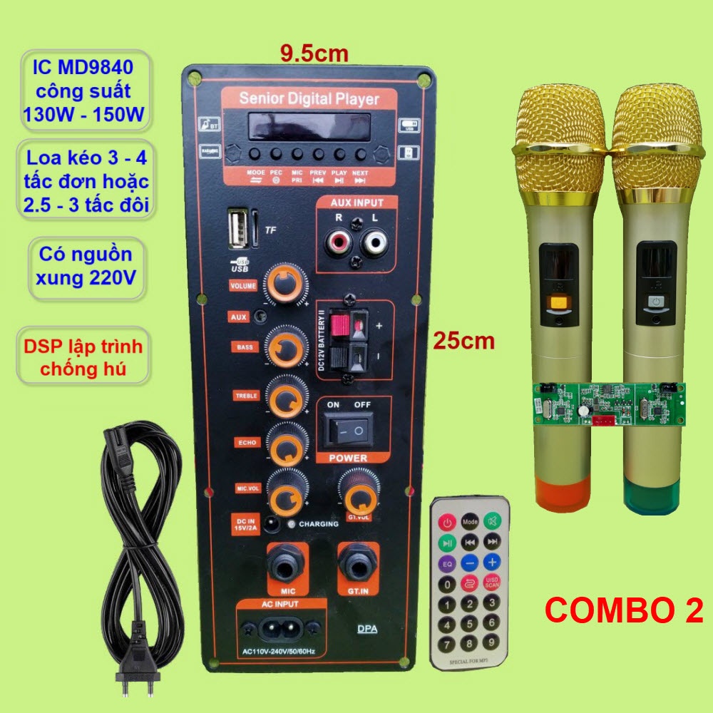 - Sản phẩm bao gồm: 1 bo mạch DPA MD9840 có nguồn xung + 1 Remote + 1 dây bình ắc qui (lắp trên mạch) + 1 dây ngõ ra loa (lắp trên mạch) + 1 dây lắp Micro không dây (lắp trên mạch) + 1 dây nguồn 220V