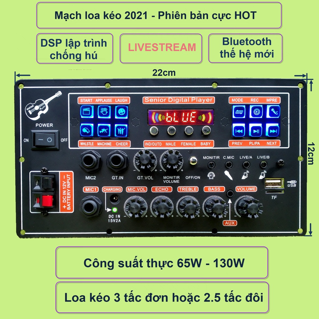 Mạch loa kéo LIVESTREAM DSP lập trình chống hú IC MD9840 công suất 65W – 130W, Bluetooth thế hệ mới, có Guitar điệnĐặc điểm nổi bật: