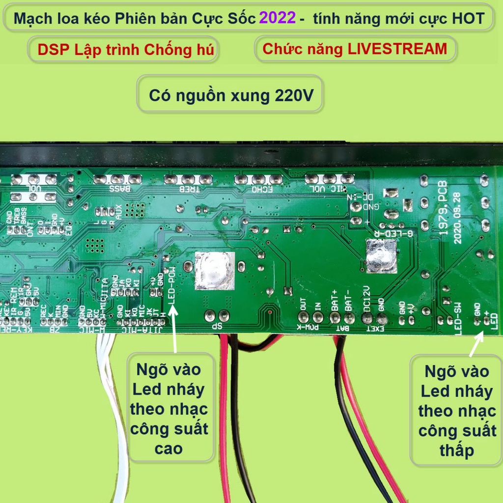 - Có 2 ngõ vào lắp Led nháy theo nhạc 12V: Ngõ 1 lắp Led nháy theo nhạc công suất thấp, ngõ 2 lắp Led nháy theo nhạc công suất cao và có công tắc on/off