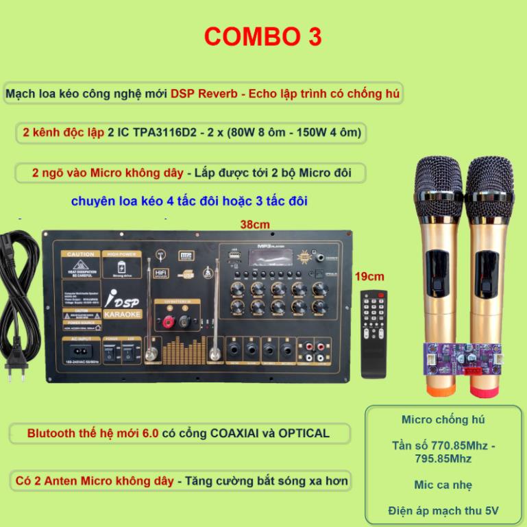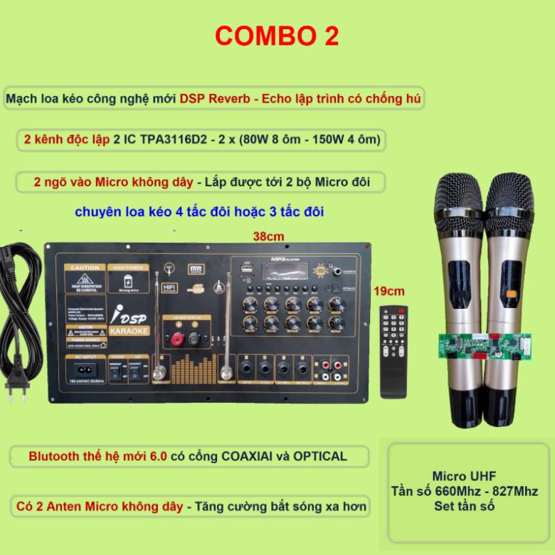 - Có ngõ 2 ngõ vào Micro không dây - dùng 2 bo mạch thu - 4 tay micro (OUT KC +8V GND)
