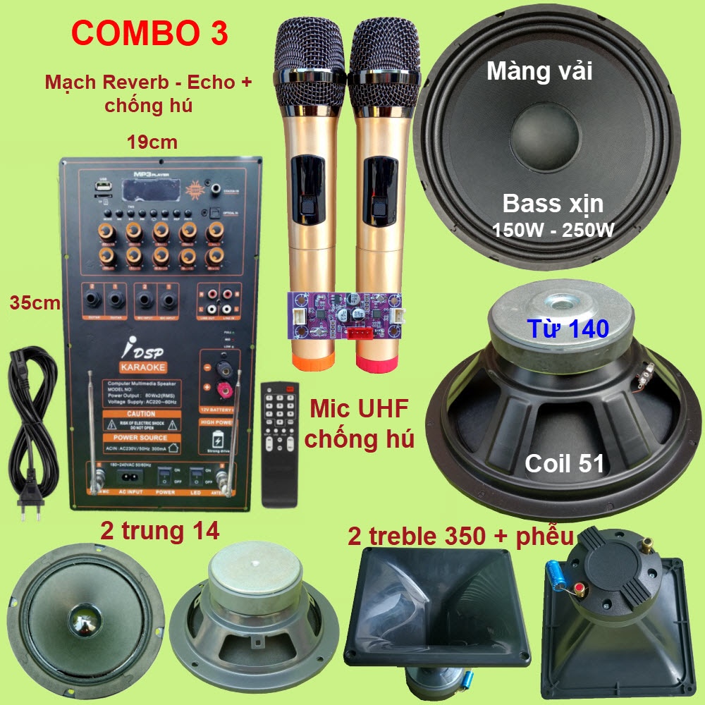 Sản phẩm bao gồm: 1 cặp Micro UHF/VHF+ 1 mạch loa kéo Reverb 2 IC TPA3116D2 + phụ kiện + 2 loa Bass 3 tấc + 2 loa Trung 14 + 2 Treble 350 6 ôm kèm phễu