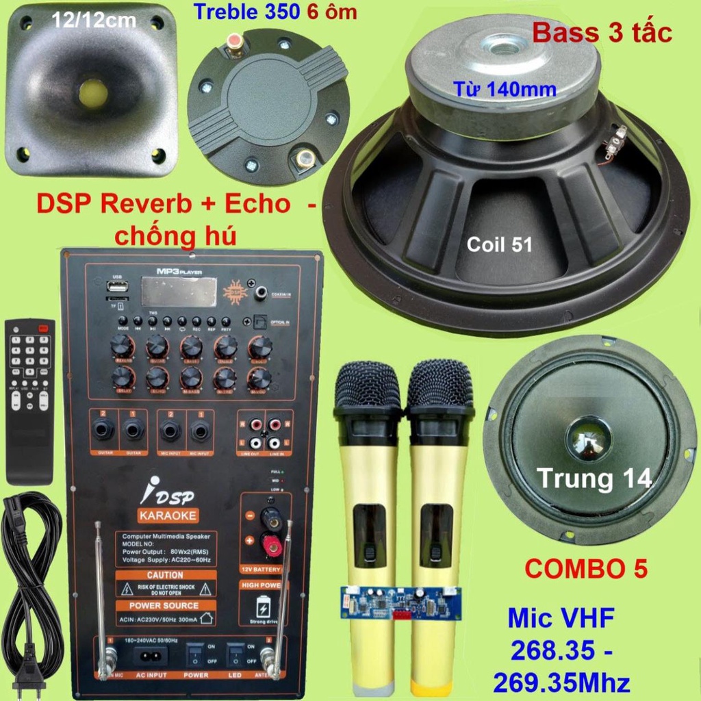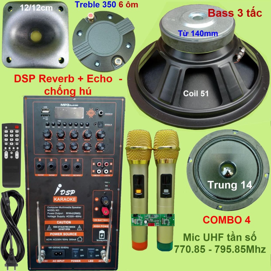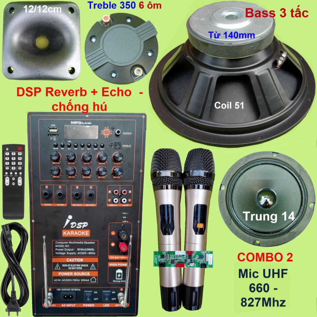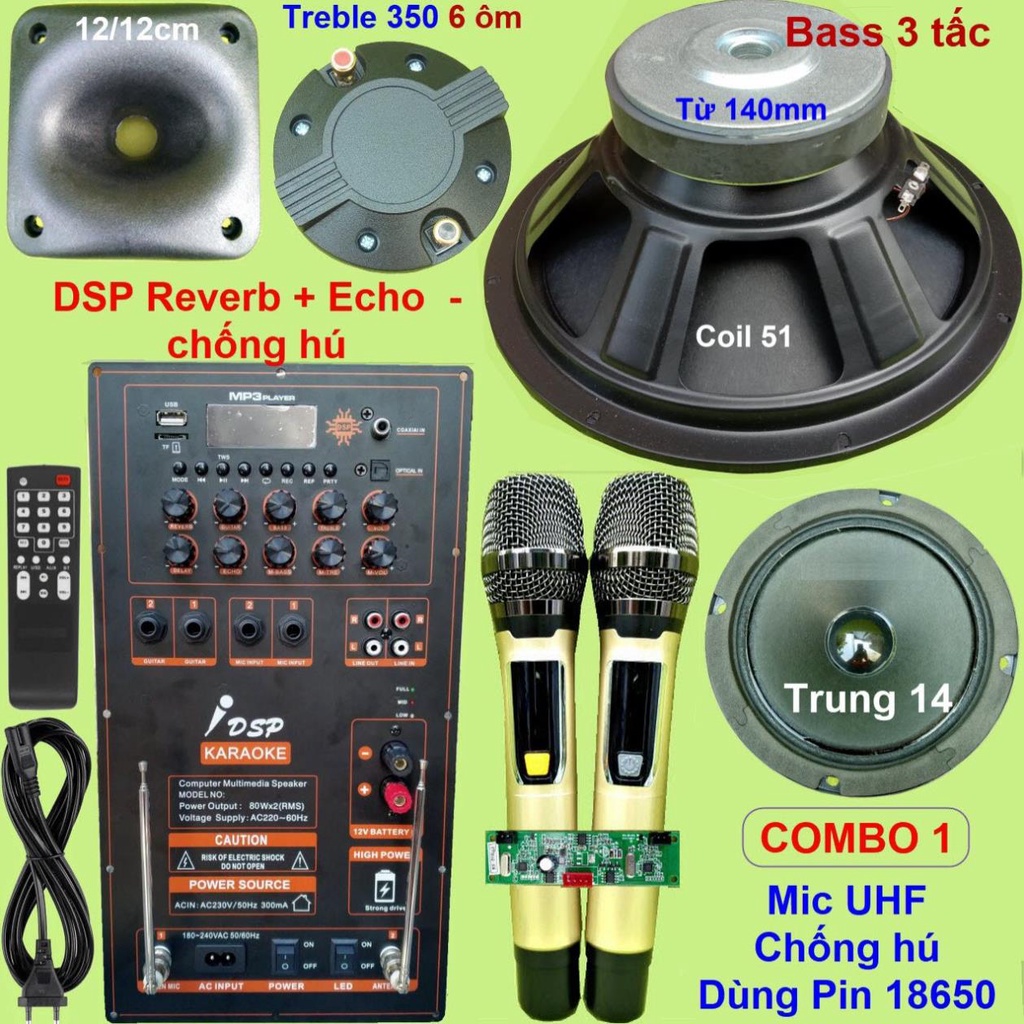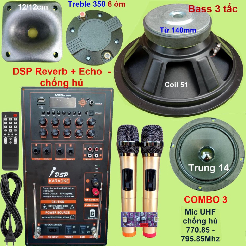 Combo gồm: 1 cặp Mic UHF/VHF + 1 mạch loa kéo Reverb IC TPA3116D2 + phụ kiện (remote + dây nguồn 220V + dây bình ắc qui + dây loa + 2 anten Micro) +1 loa Bass 3 tấc + 1 loa Trung 14 + 1 Treble 350 6 ôm kèm phễu