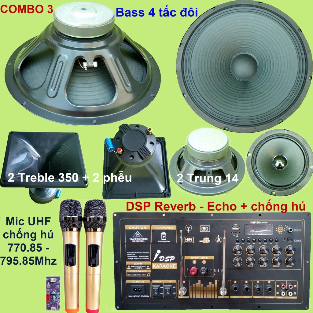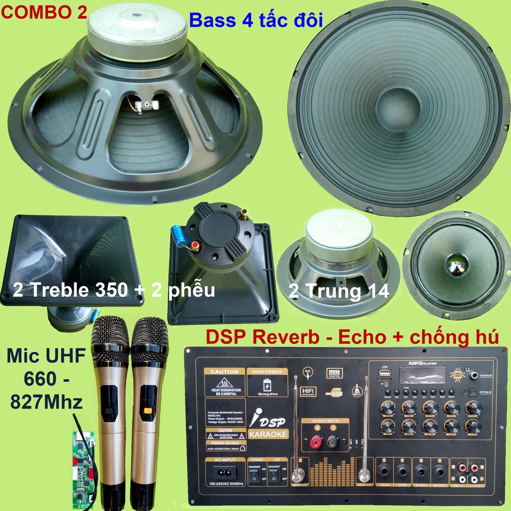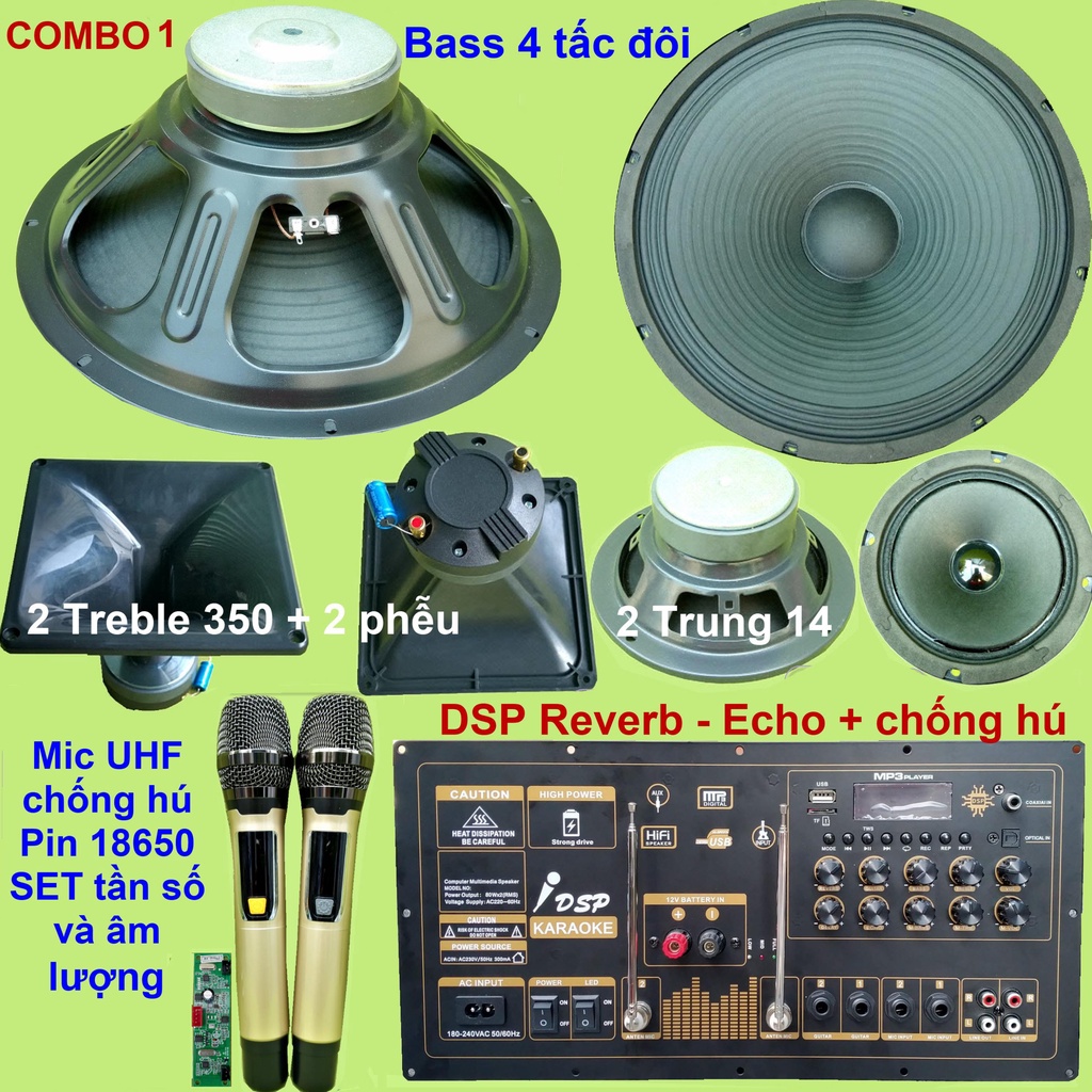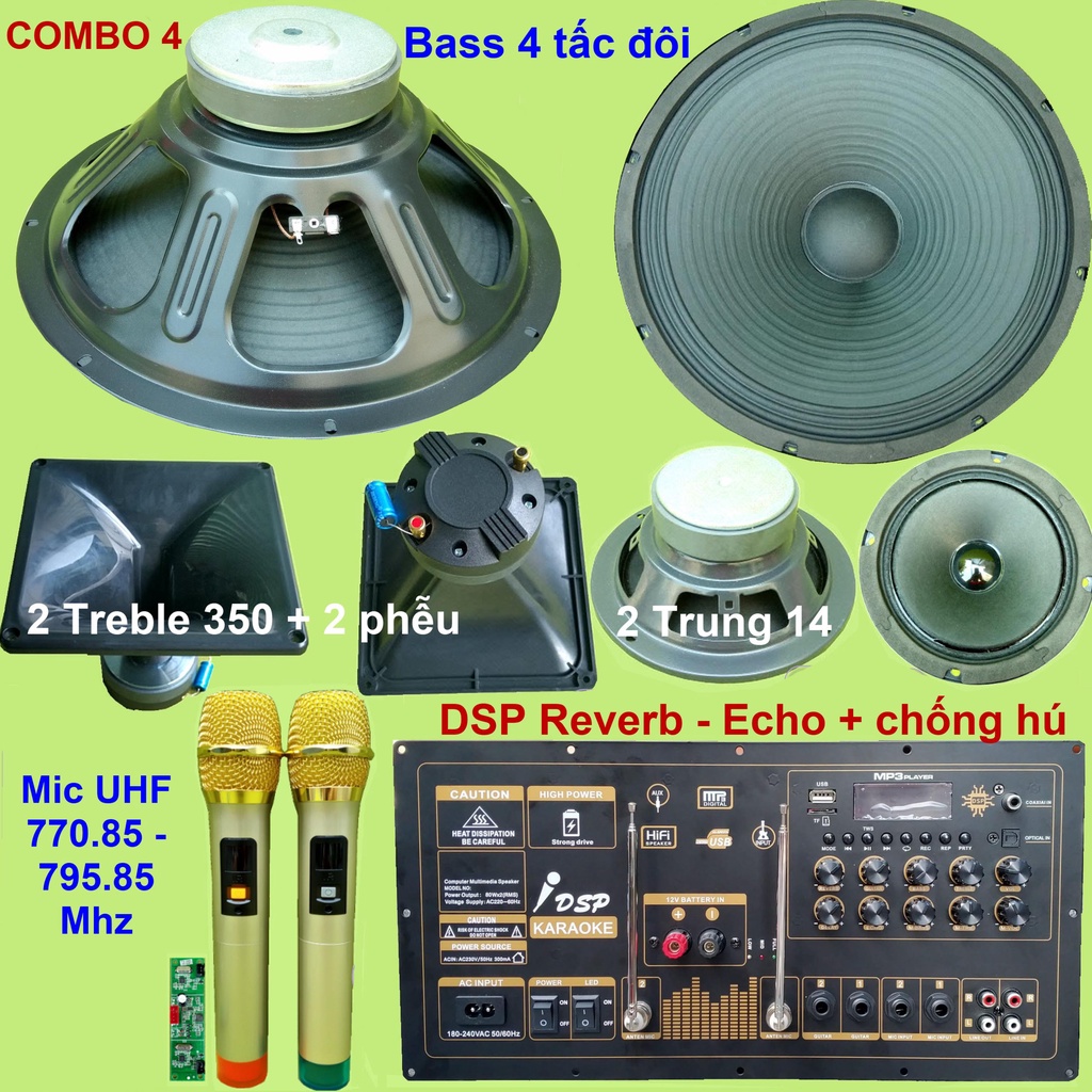 Chi tiết về loa các combo: bao gồm 2 loa Bass 4 tấc + 2 loa Trung 14 + 2 Treble 350 6 ôm