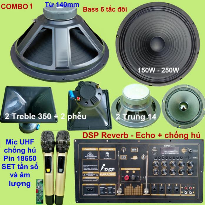 Sản phẩm bao gồm: 1 cặp Micro UHF/VHF+ 1 mạch loa kéo Reverb 2 IC TPA3116D2 + phụ kiện (remote + dây nguồn 220V + dây bình ắc qui + dây loa + 2 anten Micro) + 2 loa Bass 5 tấc + 2 loa Trung 14 + 2 Treble 350 6 ôm kèm phễu