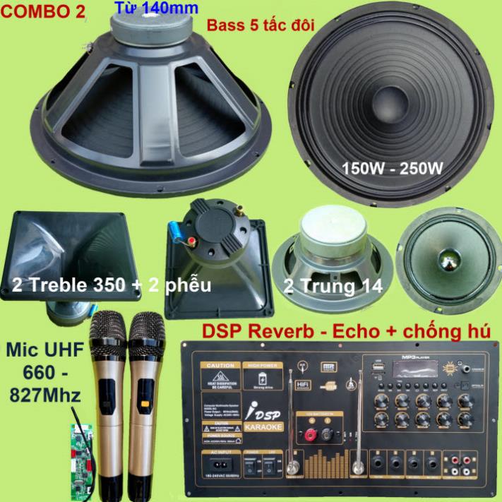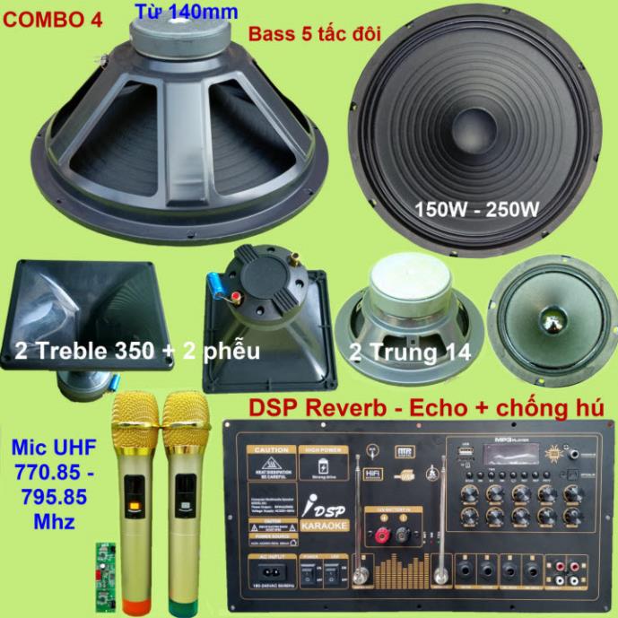 Chi tiết về loa các combo: bao gồm 2 loa Bass 5 tấc + 2 loa Trung 14 + 2 Treble 350 6 ôm