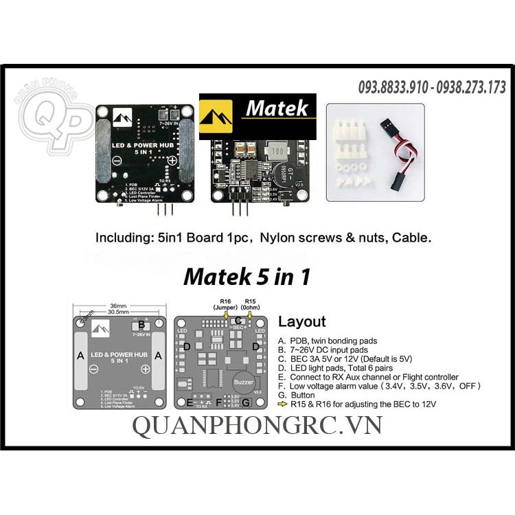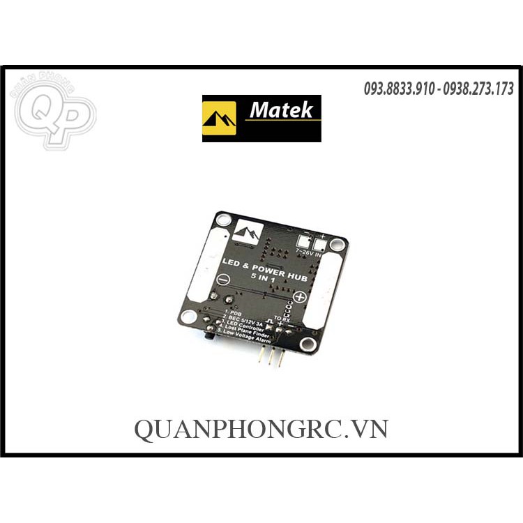 Các tính năng:- 5 trong 1 Module: bảng phân phối điện + BEC5V / 3A + Kiểm soát + Tracker + điện áp thấp báo động LED