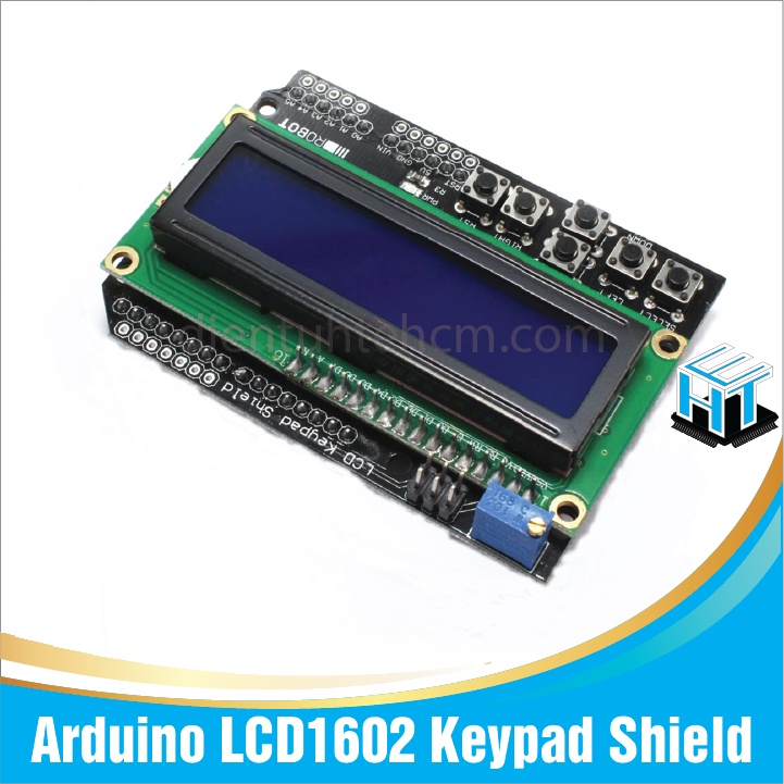LCD1602 Keypad Shield được phát triển và tương thích với các board Arduino, nhằm tạo một giao diện người dùng thân thiện, cho phép người dùng đơn giản hóa quá trình điều chỉnh và làm mạch. Module này bao gồm màn hình LCD 16×2 ký tự để hiển thị chữ trắng đèn nền xanh dương và bàn phím có 6 phím — chọn, lên, phải, xuống, trái và reset.Keypad LCD1602 được thiết kế nhỏ gọn, cắm vừa vặn lên bo Arduino, các tài liệu và code mẫu rõ ràng giúp bạn tiếp cận và sử dụng một cách nhanh chóng và dễ dàng. Đặt biệt shiled được thiết kế dùng chỉ 1 ngõ vào analog để đọc thông tin của tất cả 5 nút nhấn, việc này giúp tiết kiệm rất nhiều, nhất là trong điều kiện tài nguyên hạn hẹp của Arduino.
