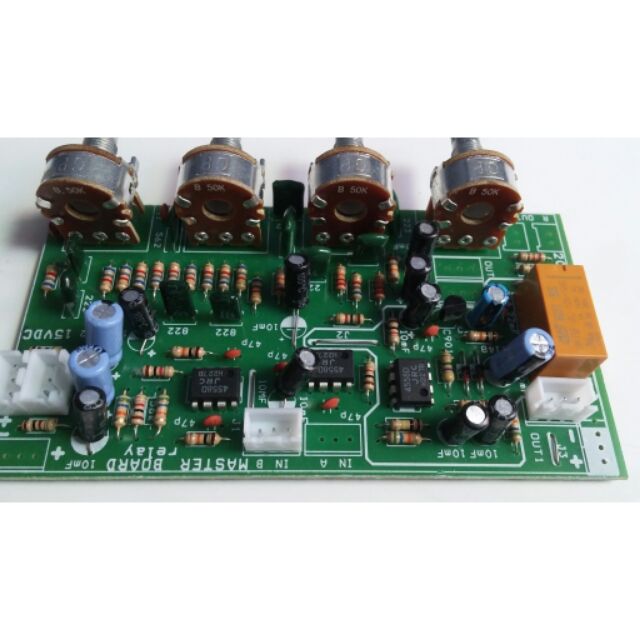 Master sử dụng 3 ic 4558. Có relay tự động mute (cắt âm thanh khi không có tín hiệu âm thanh hoặc tiếng micro )...Music có tích hợp ic nâng tiếng tạo âm thanh vòm , có chức năng tự đông giảm tiếng nhạc khi hát karaoke