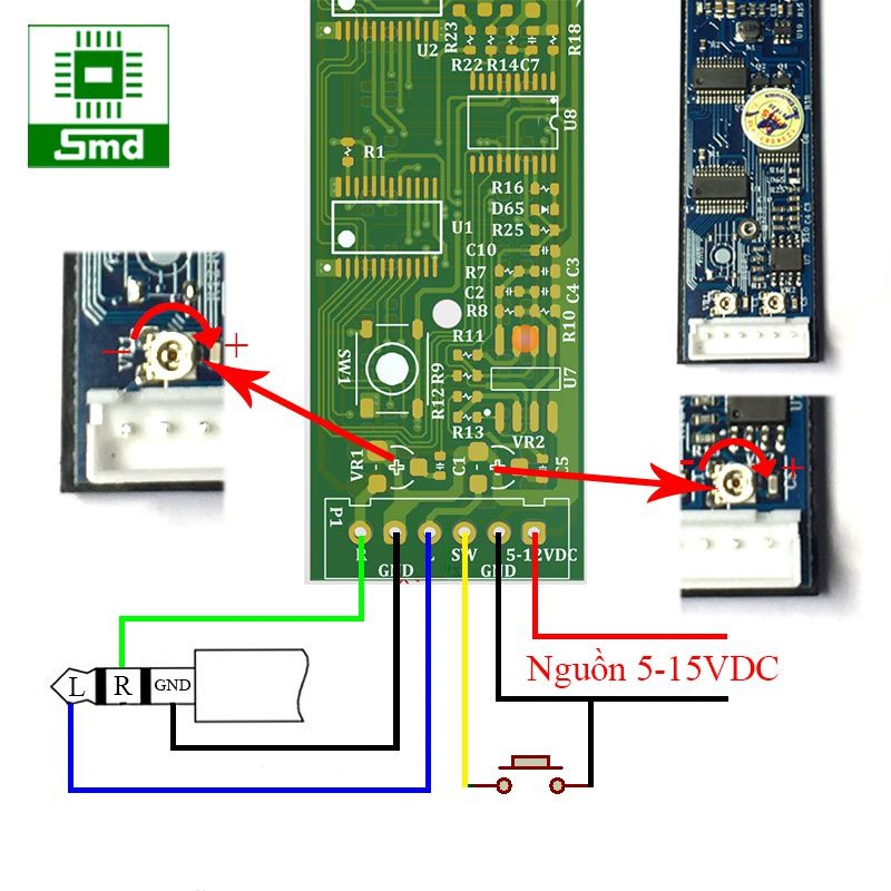 VR1, VR2 để chỉnh độ nhạy của cột led 1, cột led 2