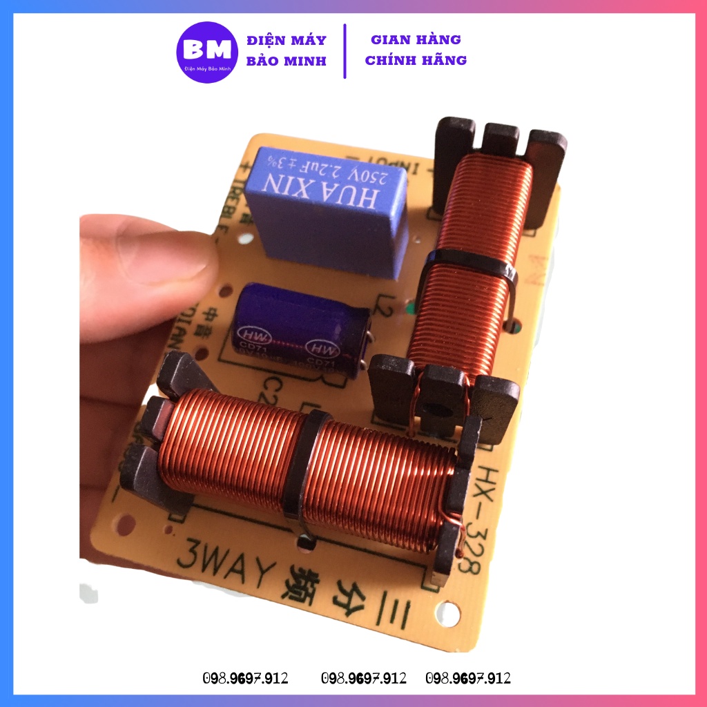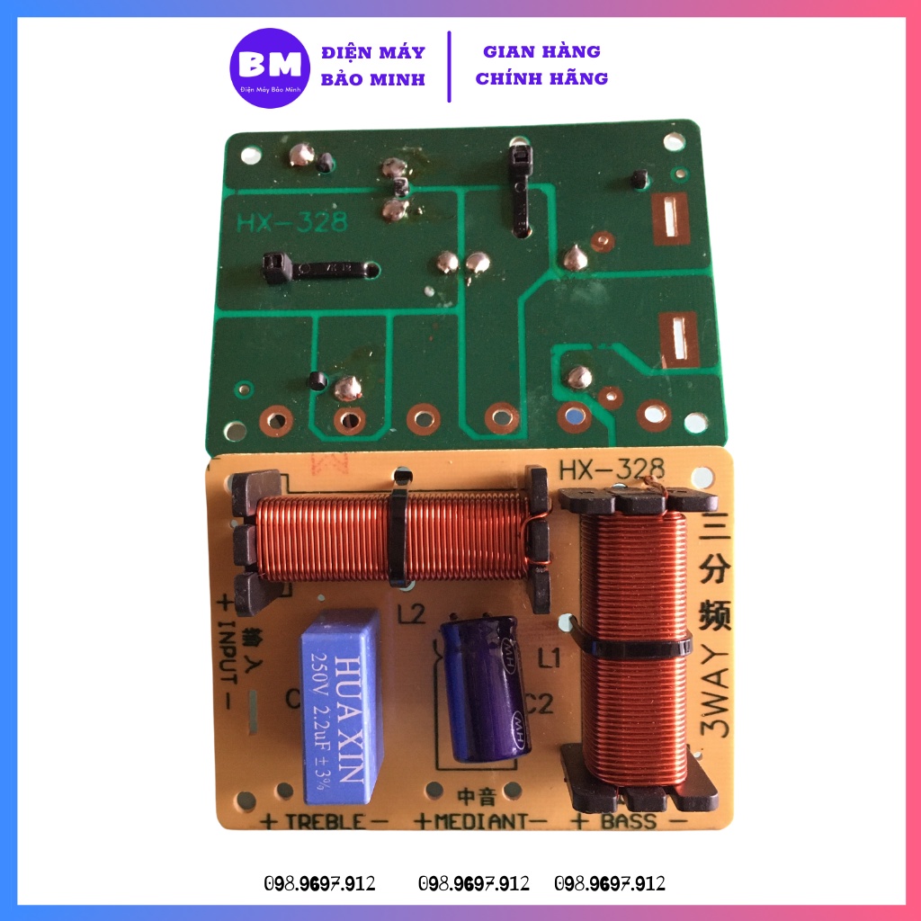 - Mạch phân tần 3 đường tiếng HX328 dùng cho 1 Bass 1 Mid 1 Treble- Mạch phân tần 3 đường tiếng HX328 với các cuộn cảm được làm bằng dây đồng đỏ 0.5li. chất lượng tốt.