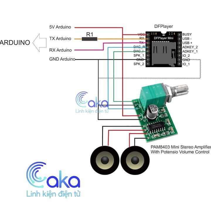 Mạch phát âm thanh MP3 Kết hợp Amply DFPlayer MiniMạch phát âm thanh MP3 tích hợp Amply DFPlayer Mini có thiết kế nhỏ gọn được sử dụng để phát âm thanh MP3 qua thẻ nhớ MicroSD giao tiếp với Vi điều khiển qua giao tiếp UART, mạch có tích hợp Amply công suất nhỏ nên có thể kết nối trực tiếp với loa (khoảng 3W) để thực hiện một số ứng dụng về âm thanh đơn giản.