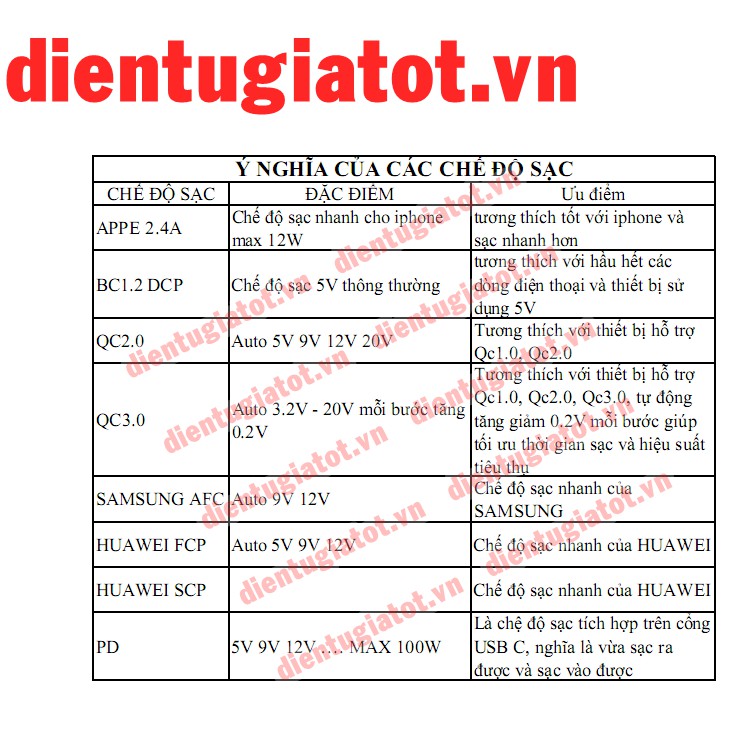 Hỗ trợ điện thoại có sạc nhanh PD, QC2.0, QC3.0, DCP BC1.2, Apple 2.4a, MTK và sạc 5V thông thườngSử dụng: Pin polymer, lion, lithium 3,3-4,2V : 18650 (cell laptop), 26650, 32650, pin điện thoại...
