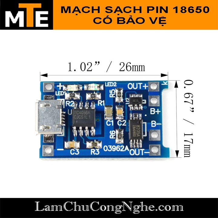 - Mạch nhỏ gọn, dùng IC TP4056.