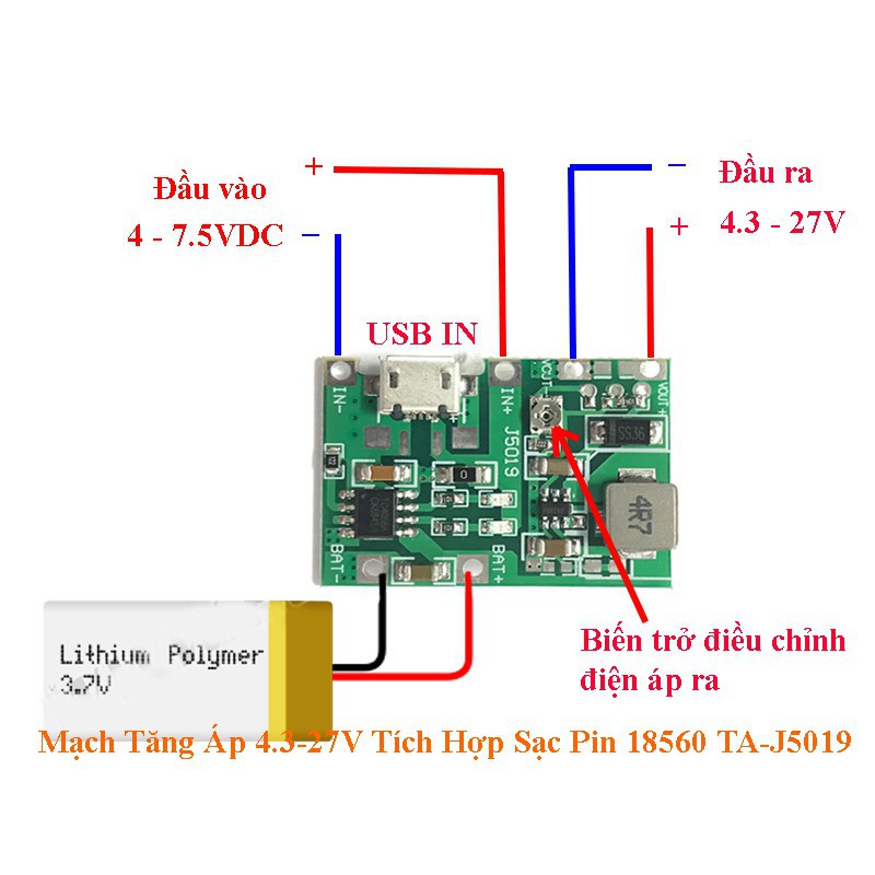 Mạch Tăng Áp 4.3-27V Tích Hợp Sạc Pin 18650 TA-J5019Mạch UPS mini