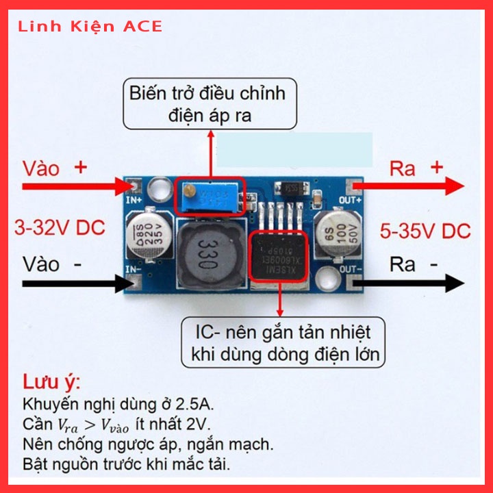- Điện áp đầu vào < Điện áp ra khoảng 2v module hoạt động ổn định.