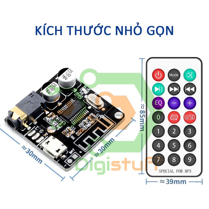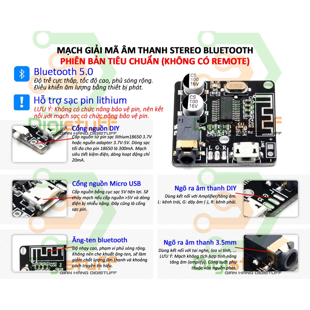 Mạch thu tín hiệu âm thanh Bluetooth 5.0 hỗ trợ âm thanh stereo là sản phẩm tuyệt vời để biến chiếc loa hay ampli của bạn trở thành một thiết bị nhận tín hiệu âm thanh không dây với chuẩn bluetooth 5.0 mới nhất. Mạch không tích hợp amply nên chỉ phù hợp cho loa vi tính hoặc làm ngõ vào cho amply, không phù hợp để kết nối trực tiếp với loa.*** THÔNG SỐ KỸ THUẬT: