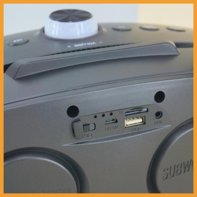 - Phía sau thân loa là các nút tắt bật nguồn, cổng sạc pin, cổng kết nối USB, khe cắm thẻ nhớ và cổng 3.5 để lấy âm thanh từ tivi hay điện thoại...